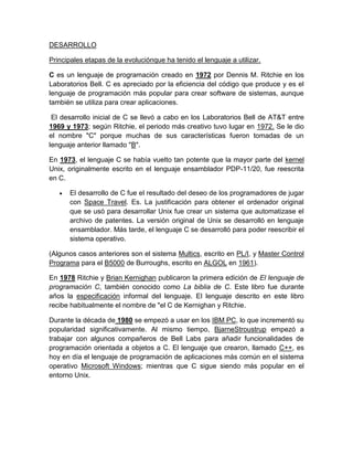 El lenguaje C fue creado en 1972 por Dennis Ritchie en los Laboratorios Bell. Fue desarrollado inicialmente entre 1969 y 1973 para reescribir el núcleo de Unix, originalmente escrito en ensamblador. En 1978, Ritchie y Kernighan publicaron el libro "El lenguaje de programación C", estableciendo las especificaciones informales del lenguaje. C se ha utilizado ampliamente para software de sistemas y aplicaciones, y su popularidad aumentó con su uso en los primeros PC de IBM en la década de 1980.