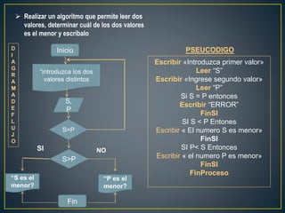El documento contiene 6 algoritmos y diagramas de flujo para resolver diferentes problemas matemáticos y de lógica. El primer algoritmo determina qué número de dos valores ingresados es menor. El segundo lee cuatro números diferentes e imprime el mayor y el menor. El tercero calcula el promedio de precios en tres establecimientos. El cuarto calcula la hipotenusa de un triángulo rectángulo. El quinto simula una caja registradora. Finalmente, el sexto resume cada algoritmo y diagrama de flujo propuesto.