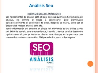 Este documento describe varias herramientas de análisis SEO como Popuri, Raven, Websitegrader y SEOCentro. Estas herramientas proporcionan información sobre el pagerank, enlaces, densidad de palabras clave y otros factores importantes para el posicionamiento en buscadores. También define social media como medios diseñados para compartir contenido a través de la interacción social en internet y redes sociales.