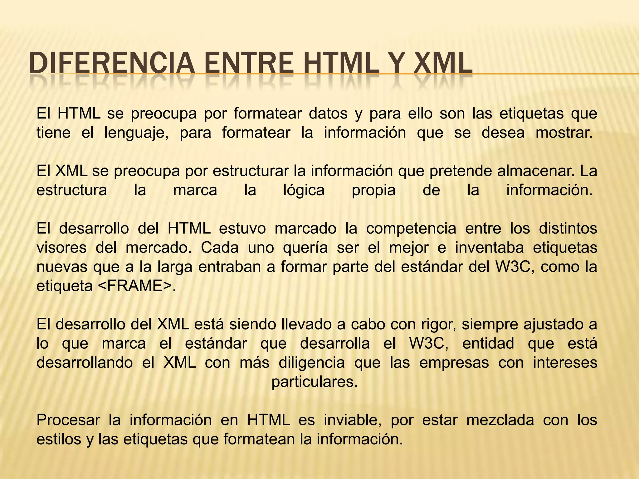 El XML sirve para estructurar y describir información de manera lógica y portable, mientras que el HTML sirve para dar formato a la información y presentarla en los navegadores web. Ambos lenguajes se basan en SGML pero XML es un metalenguaje que permite crear etiquetas personalizadas, a diferencia de HTML que tiene etiquetas predefinidas.