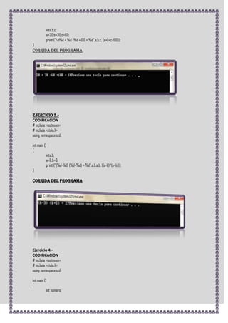 Este documento presenta 21 ejercicios de programación en C++. Cada ejercicio incluye el código de programación y una sección para la ejecución del programa. Los ejercicios cubren temas como bucles, condicionales, vectores, matrices y ordenamiento burbuja.