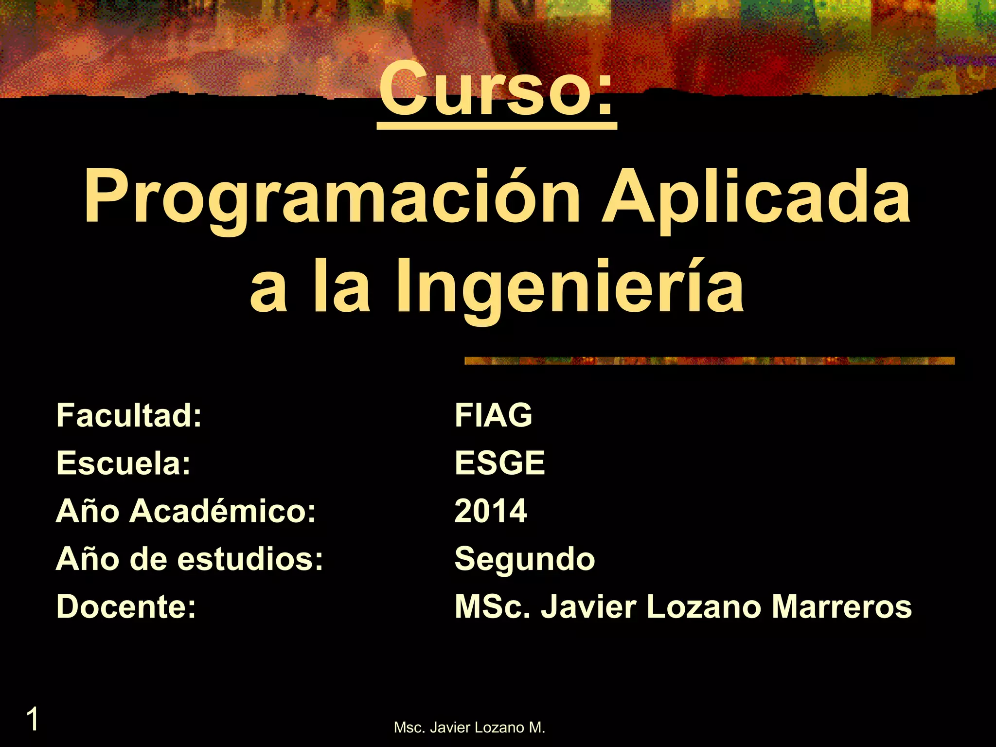 Este documento presenta una introducción al lenguaje de programación MATLAB. Explica conceptos básicos como entrada y salida de datos, instrucciones de asignación, sentencias condicionales y repetitivas. También muestra ejemplos de programas sencillos y la interfaz gráfica GUIDE para crear programas visuales en MATLAB.