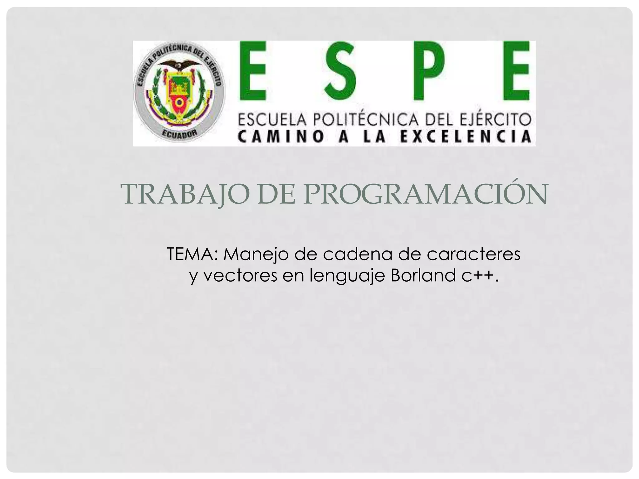 Este documento resume el manejo de cadenas de caracteres y vectores en lenguaje Borland C++. Explica que las cadenas de caracteres son arreglos de caracteres y cómo declararlas estática y dinámicamente. También cubre operaciones como asignación, concatenación, contabilidad y comparación de cadenas. Finalmente, define vectores como espacios continuos en memoria y explica su declaración, asignación de elementos y ejemplos de uso como buscar el máximo en un vector.