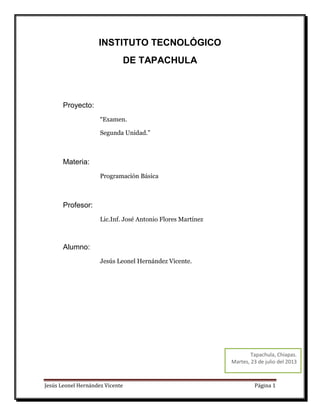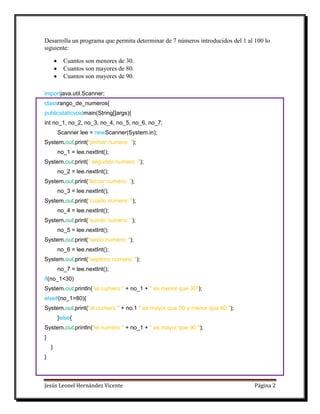 Este documento presenta dos programas de Java desarrollados por Jesús Leonel Hernández Vicente para su clase de Programación Básica. El primer programa determina cuántos de 7 números introducidos están por debajo de 30, por encima de 80 y por encima de 90. El segundo programa calcula el costo de una llamada telefónica basado en su duración.