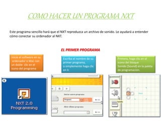 Este documento proporciona instrucciones para crear un programa simple en NXT que reproduzca un archivo de sonido. Explica cómo iniciar el software de programación, arrastrar un bloque de sonido a la zona de trabajo y descargar y ejecutar el programa en el NXT para reproducir el sonido. También incluye una breve presentación de la interfaz del software de programación.