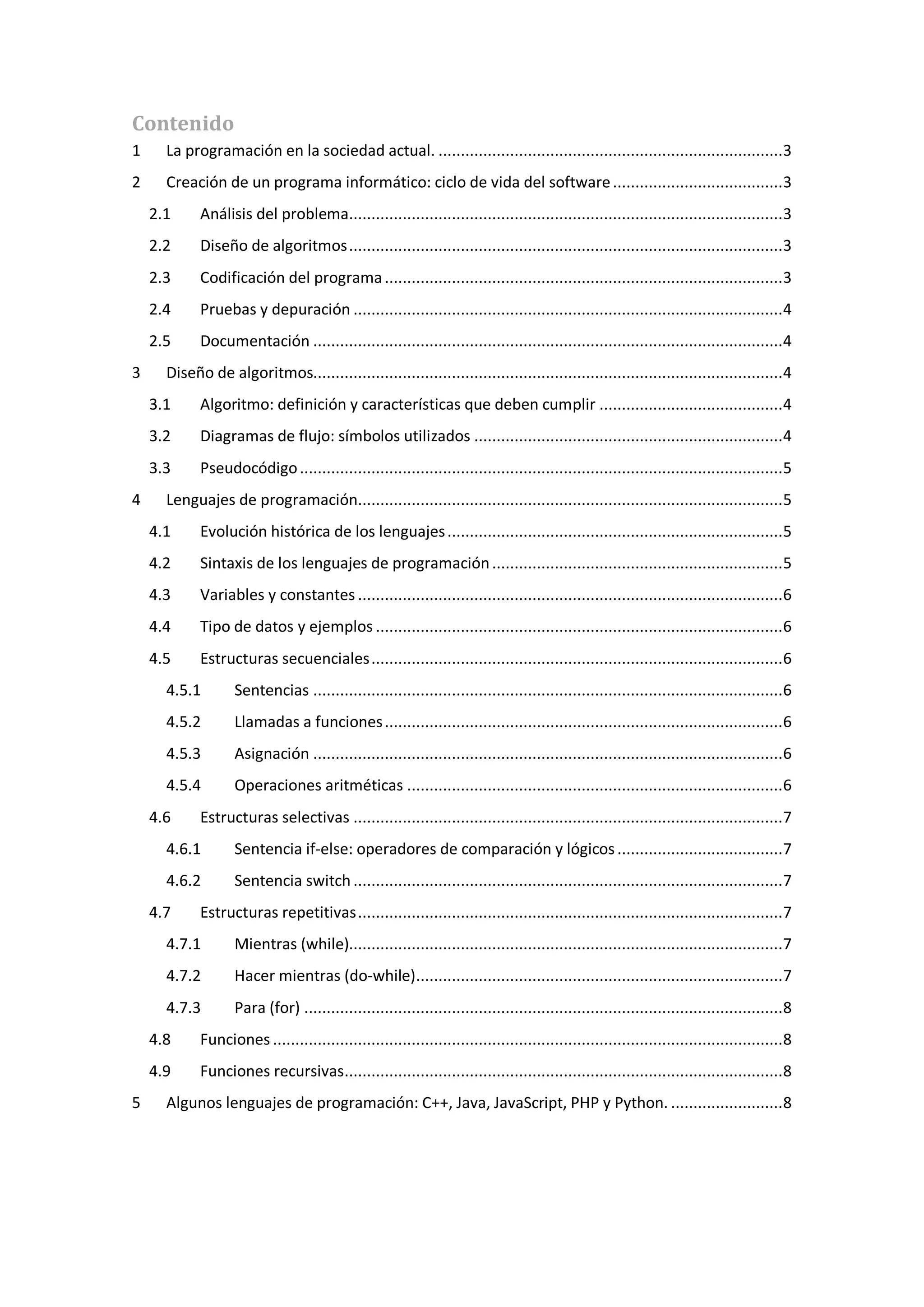 El documento aborda la programación informática y su relevancia en la sociedad actual, describiendo el ciclo de vida del software desde el análisis del problema hasta la documentación. Se exploran distintos aspectos del diseño de algoritmos, lenguajes de programación y estructuras fundamentales que facilitan la creación de software, incluyendo conceptos como funciones, variables y estructuras de control. Además, presenta ejemplos de lenguajes de programación como C++, Java, JavaScript, PHP y Python, describiendo sus características y aplicaciones.