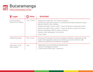El 9 de octubre se llevarán a cabo diversas actividades en Bucaramanga y municipios circundantes, incluyendo espectáculos de circo y comedia, bailoterapia y atención psicológica. También habrá promociones especiales en restaurantes y centros comerciales para mujeres, tales como descuentos y cocteles de bienvenida. Se fomenta la participación femenina con eventos culturales y charlas sobre el buen trato y la autoestima.