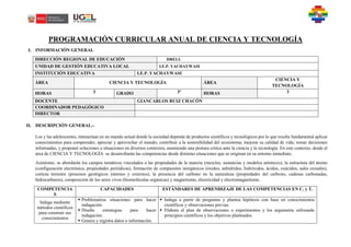 Este documento presenta el programa curricular anual de Ciencia y Tecnología para tercer grado. Incluye información general sobre la institución educativa, una descripción general de los contenidos a abordar, las competencias y estándares de aprendizaje, y la temporalización del programa por bimestres. Los estudiantes desarrollarán competencias a través de situaciones de su entorno en áreas como propiedades de la materia, estructura atómica, compuestos inorgánicos, corteza terrestre y biomoléculas.