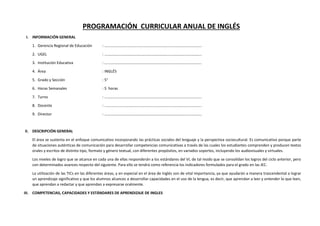 El documento detalla la programación curricular anual de inglés para el quinto grado, enfocándose en el desarrollo de competencias comunicativas a través de un enfoque comunicativo y el uso de TIC. Se describen las metas de aprendizaje en las áreas de expresión oral, lectura y escritura, destacando la importancia de las prácticas sociales del lenguaje. Además, se presentan enfoques transversales para promover la equidad, la inclusión y la conciencia ambiental en el aprendizaje.