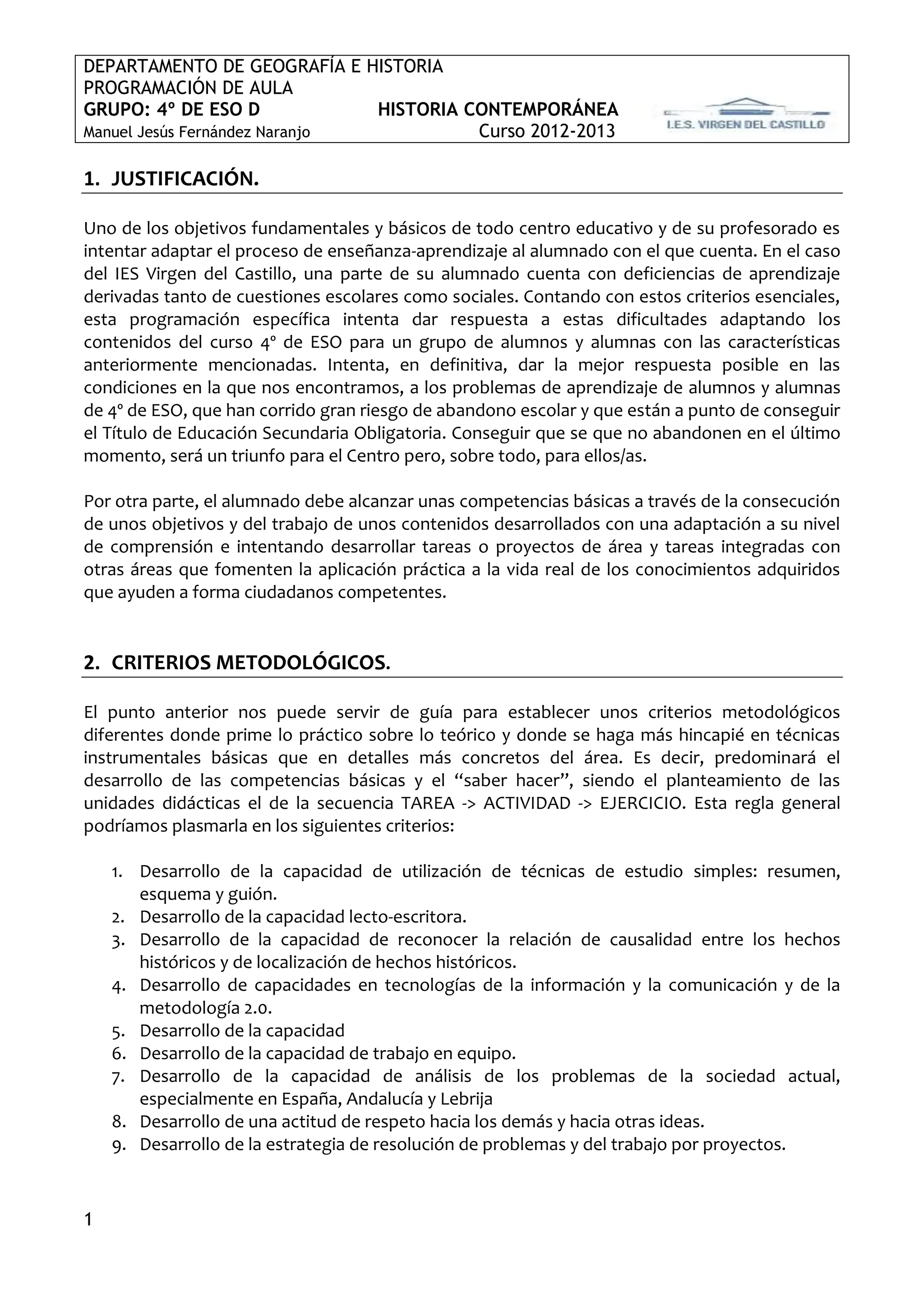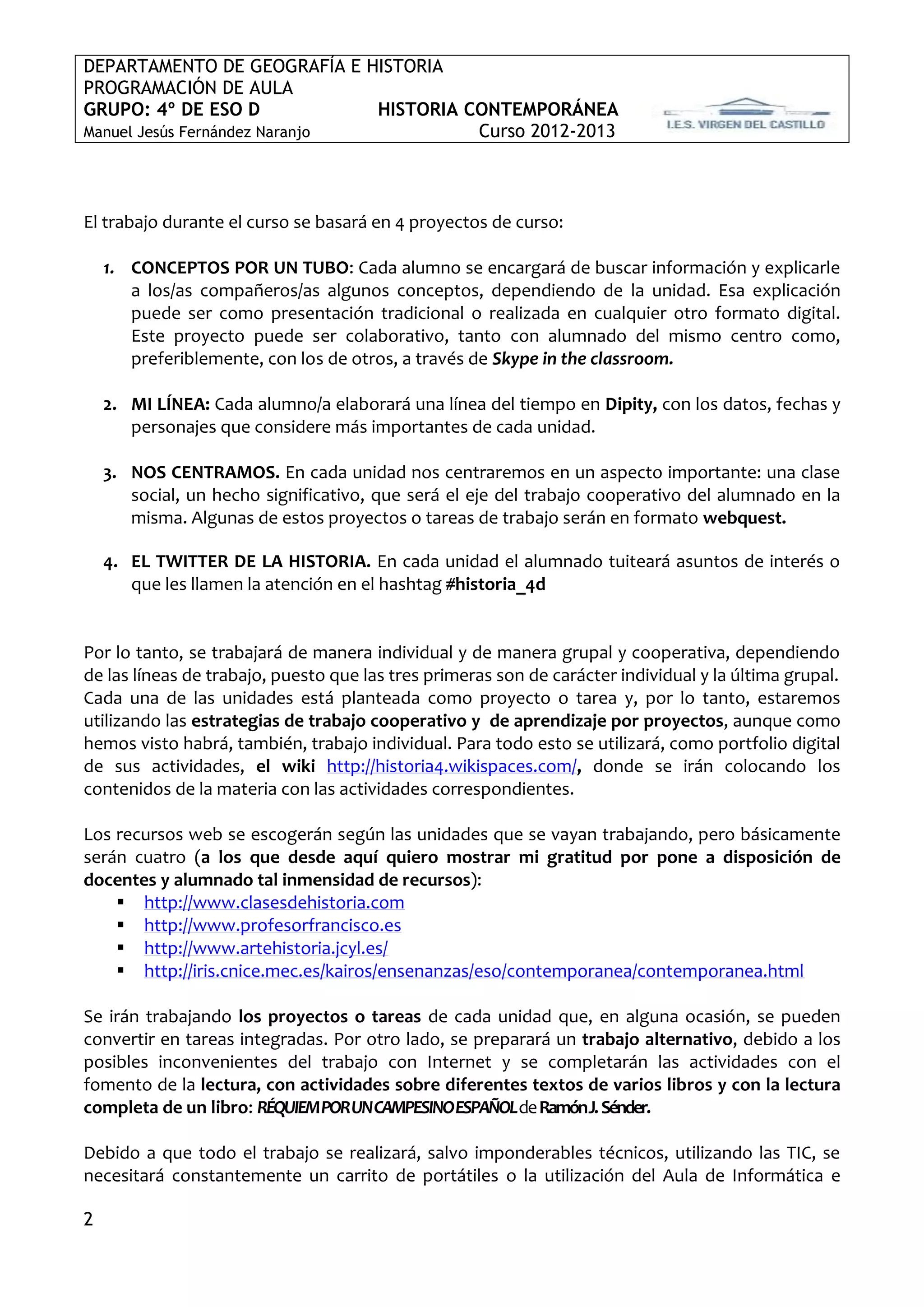 Este documento presenta la programación de aula para un grupo de 4o de la ESO en historia contemporánea. La programación se enfoca en alumnos con dificultades de aprendizaje y riesgo de abandono escolar. El objetivo es ayudarlos a desarrollar competencias básicas y adquirir los conocimientos necesarios para obtener el título de la ESO a través de proyectos prácticos y el uso de las TIC. El trabajo se basará en cuatro proyectos colaborativos durante el curso y se mantendrá