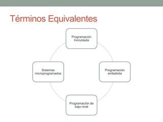 Este documento describe la programación avanzada o embebida, que es software preciso y compacto que se ejecuta dentro de dispositivos para controlarlos en tiempo real. Explica que los datos pueden ser análogos o digitales y que los computadores embebidos se usan comúnmente en bombas de gasolina. También describe cómo los sistemas embebidos se comunican con el mundo real a través de sensores, conversión de datos y actuadores, y cómo el hardware y software están estrechamente relacionados.