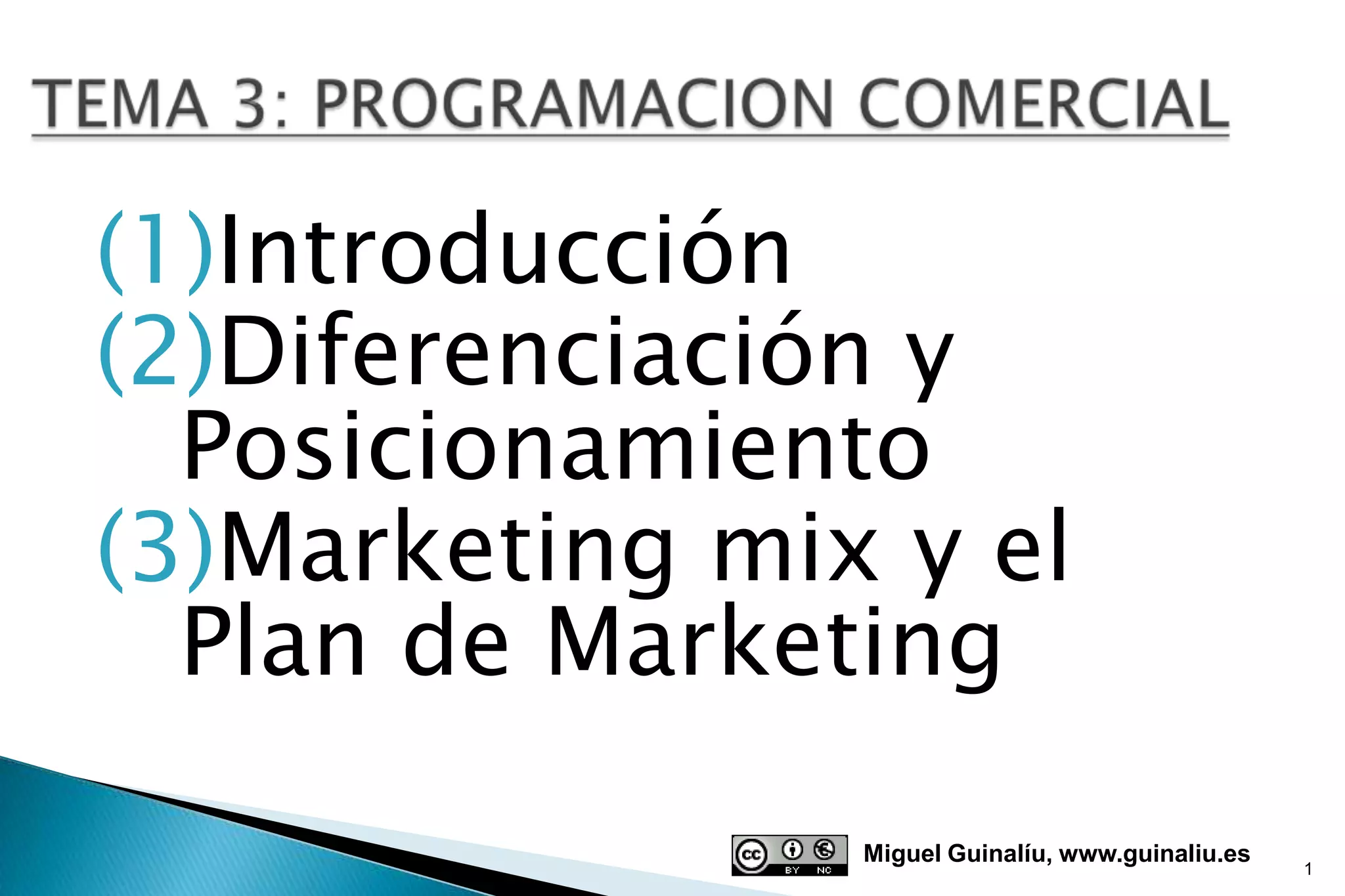 El documento explica conceptos clave de marketing como la diferenciación, el posicionamiento y el mix de marketing. Describe cómo las empresas pueden lograr la diferenciación a través del producto, servicios, distribución, comunicación y marca. Explica los componentes de un plan de marketing efectivo, incluyendo el análisis del entorno, objetivos, estrategias, presupuesto y control.