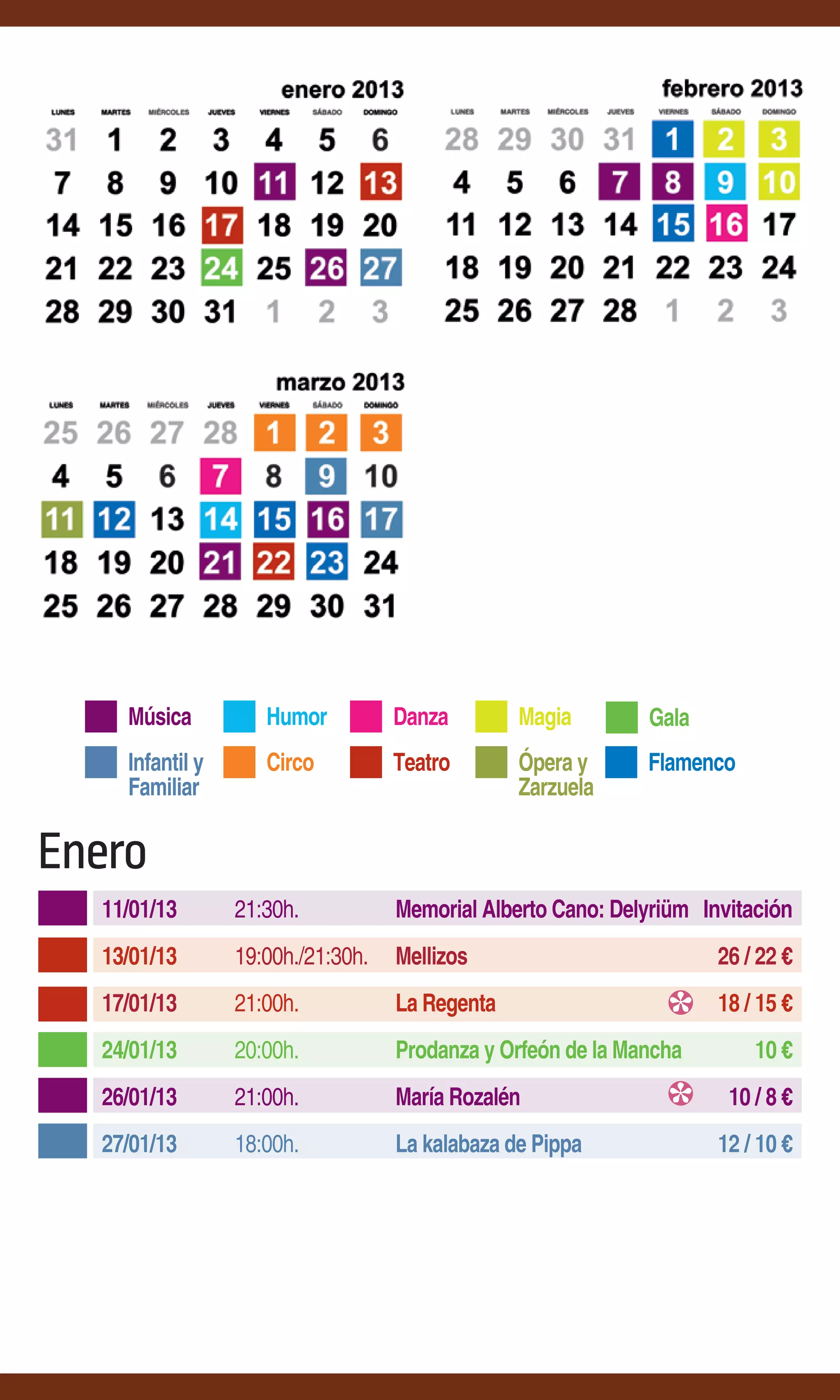 El documento presenta la programación cultural de enero a marzo en el Teatro Circo de Albacete, incluyendo conciertos, obras de teatro, danza y espectáculos de magia y circo. Se ofrece información sobre artistas como Delyriüm, Mellizos, La Regenta, Prodanza y Orfeón de la Mancha, Duquende, Café Cantante, Niña Pastori y otros. La programación incluye diferentes géneros como música, humor, danza, magia, gala flamenca, teatro, ópera y zarzuela.