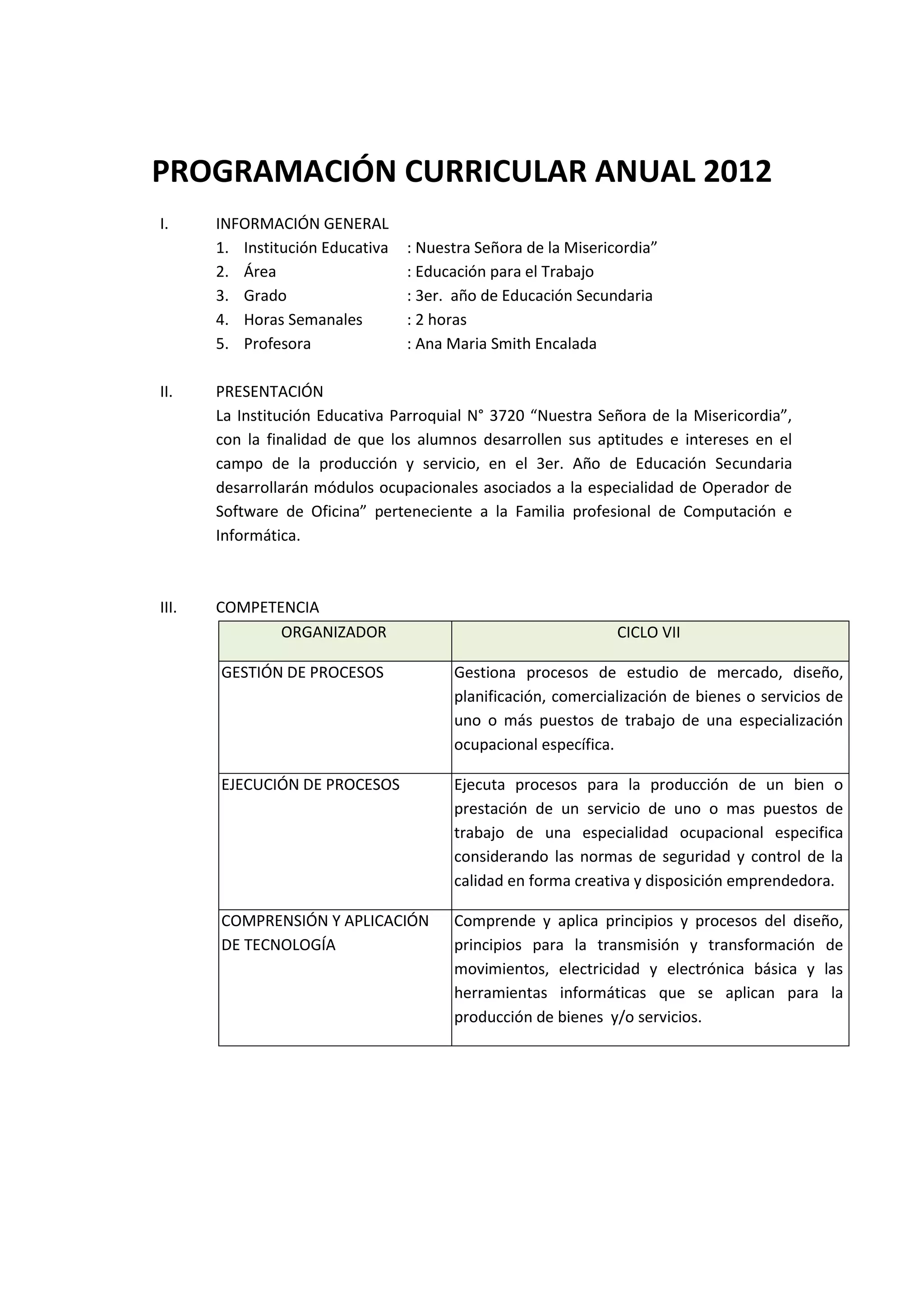 Este documento presenta el programa curricular anual para el área de Educación para el Trabajo en el tercer año de Educación Secundaria de la Institución Educativa Parroquial N° 3720 “Nuestra Señora de la Misericordia”. El programa se centra en desarrollar módulos ocupacionales relacionados con el puesto de trabajo de Operador de Software de Oficina y cubre competencias, valores, calendario, unidades didácticas, estrategias, materiales y evaluación.