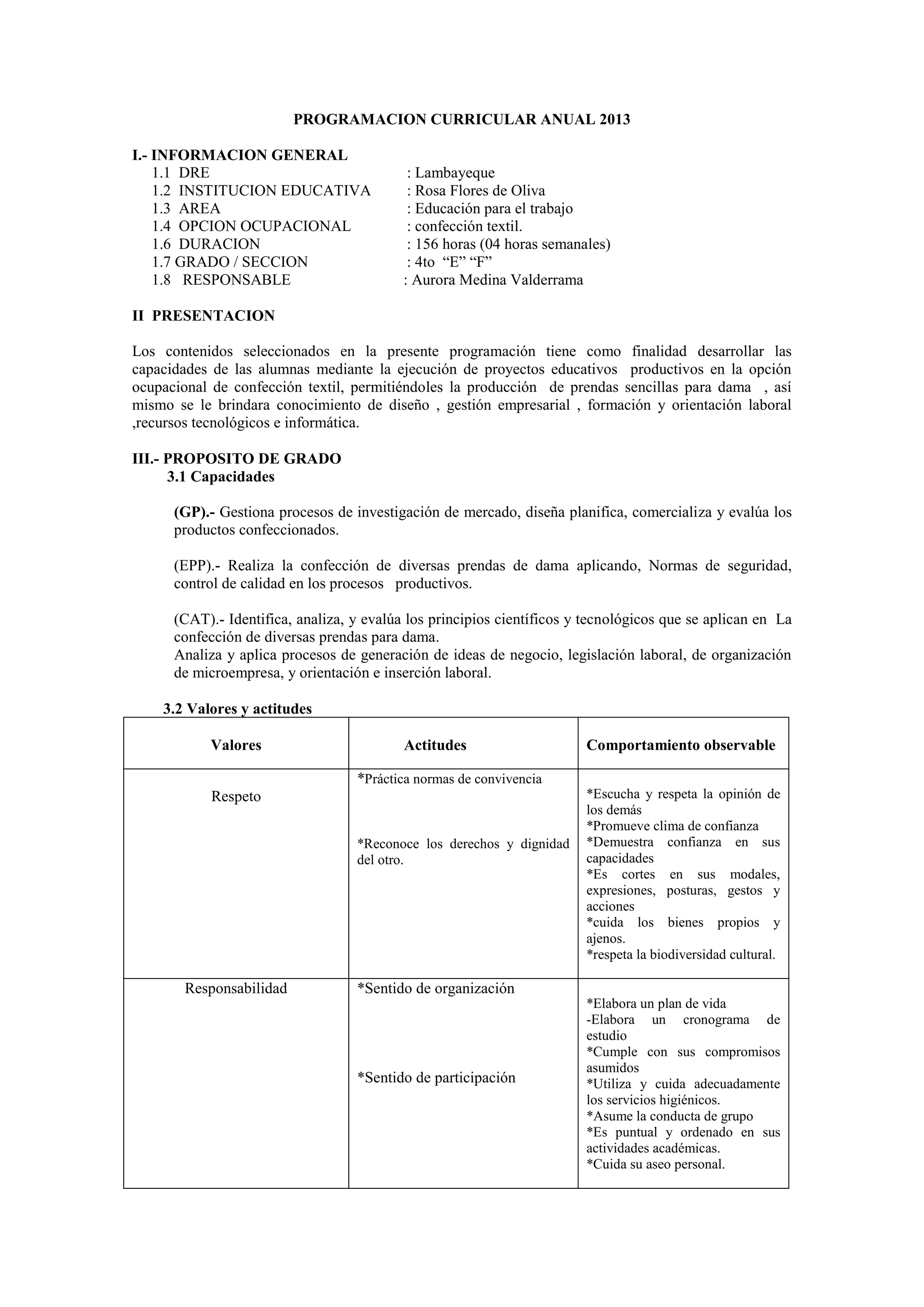 Este documento presenta la programación curricular anual 2013 para el área de Educación para el Trabajo, opción ocupacional de Confección Textil, para los grados 4to E y F de la Institución Educativa Rosa Flores de Oliva en Lambayeque. La programación incluye información general, objetivos, temas transversales, calendarización, organización de unidades didácticas y estrategias metodológicas. Los contenidos se centran en el desarrollo de habilidades de confección a través de proyectos educativos productivos