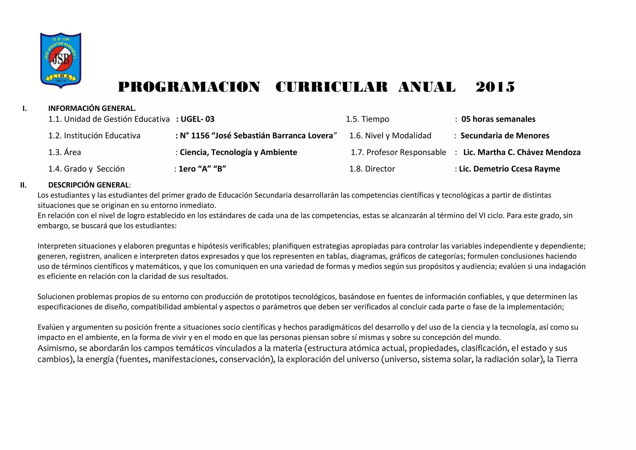 Este documento presenta el programa curricular anual para el área de Ciencia, Tecnología y Ambiente para los grados 1ero A y B de educación secundaria. El programa consta de 8 unidades que abordan diversos temas científicos y se implementará a través de 54 sesiones de 5 horas semanales. Cada unidad incluye objetivos de aprendizaje, competencias a desarrollar, y productos esperados. El programa promueve un enfoque basado en situaciones problémicas del entorno de los estudiantes y la articulación con otras