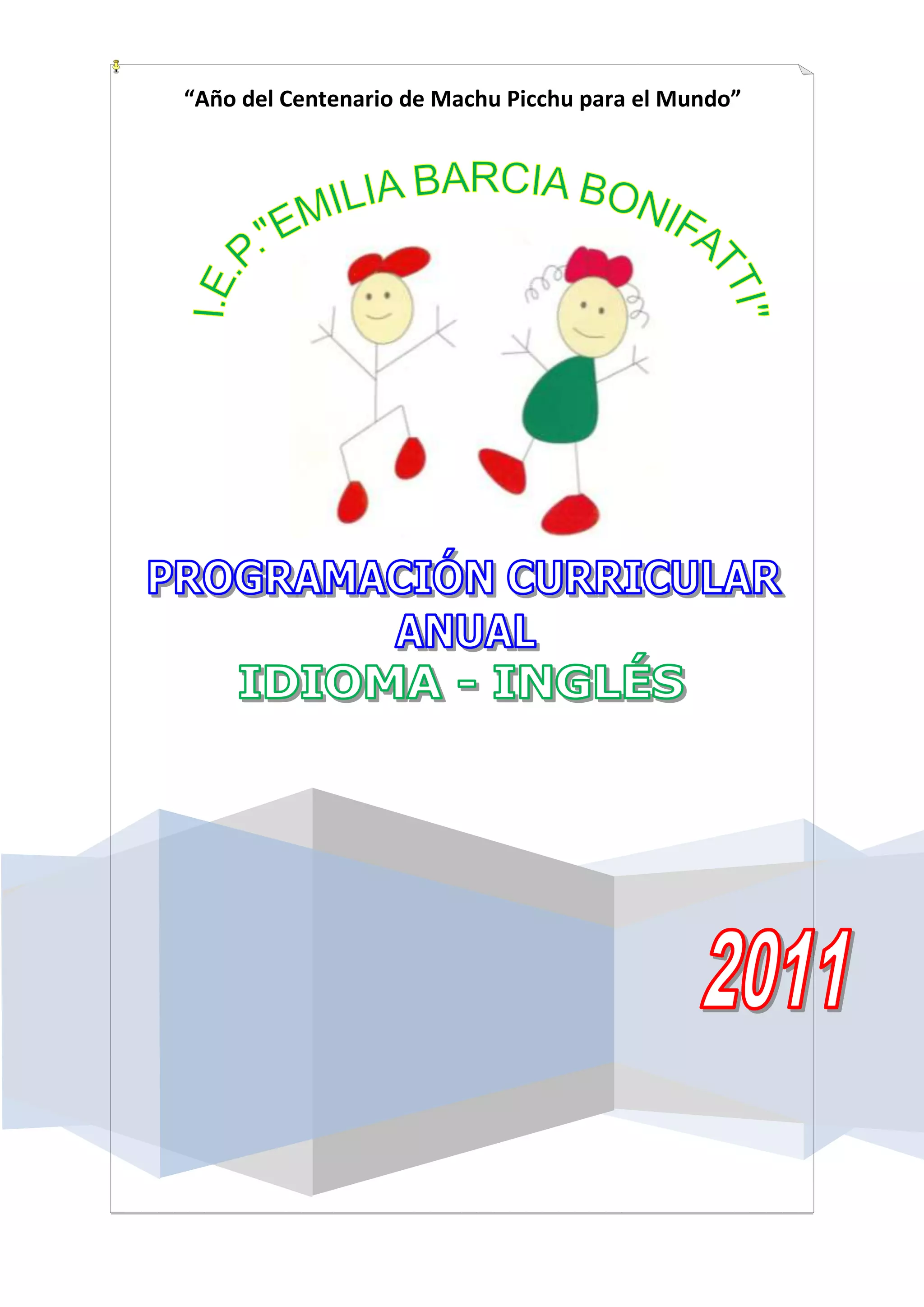 Este documento presenta la programación curricular anual para el área de idioma extranjero - inglés para los grados 1o, 2o y 3o de una institución educativa en Perú. Incluye la fundamentación, competencias, calendarización, organización de unidades didácticas y estrategias metodológicas para la enseñanza del inglés a lo largo del año escolar.