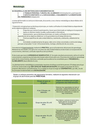 El documento detalla la temporización y justificación de los objetivos del módulo 1 de un curso sobre normas higiénico-sanitarias en restauración. Se describe la distribución horaria, metodología de enseñanza y actividades prácticas que buscan capacitar al alumnado en la aplicación de normas de higiene y seguridad alimentaria. Además, se presentan dinámicas de grupo y estudios de caso para fomentar el aprendizaje significativo y la colaboración entre los alumnos.