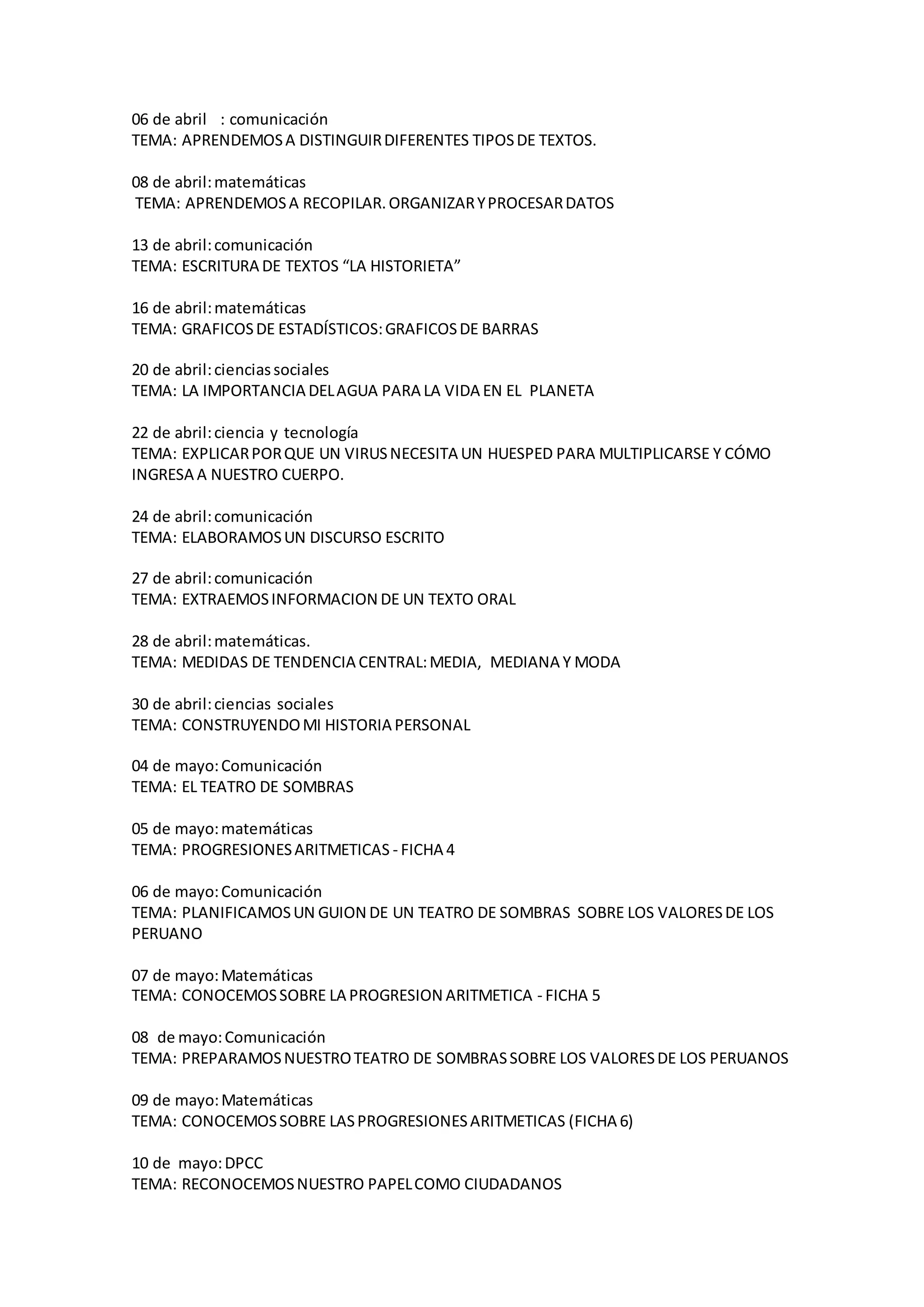 El documento lista las fechas y temas de estudio de varias semanas. En las semanas del 6 al 30 de abril, los temas incluyeron aprender sobre diferentes tipos de textos, estadísticas, el agua, virus y cómo ingresan al cuerpo, discursos escritos, extraer información de textos orales, y medidas de tendencia central. Del 4 al 15 de mayo, los temas fueron teatro de sombras, progresiones aritméticas, planificar un guion y presentar un teatro de sombras sobre valores peruanos, y diseñar un m