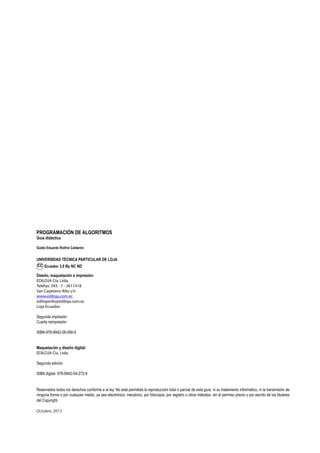 Este documento presenta una guía didáctica para la asignatura de Programación de Algoritmos. La guía explica los cinco contenidos principales de la asignatura, distribuidos en dos bimestres. También describe los lineamientos del modelo educativo basado en competencias de la universidad y proporciona orientaciones para el estudio y la bibliografía recomendada.