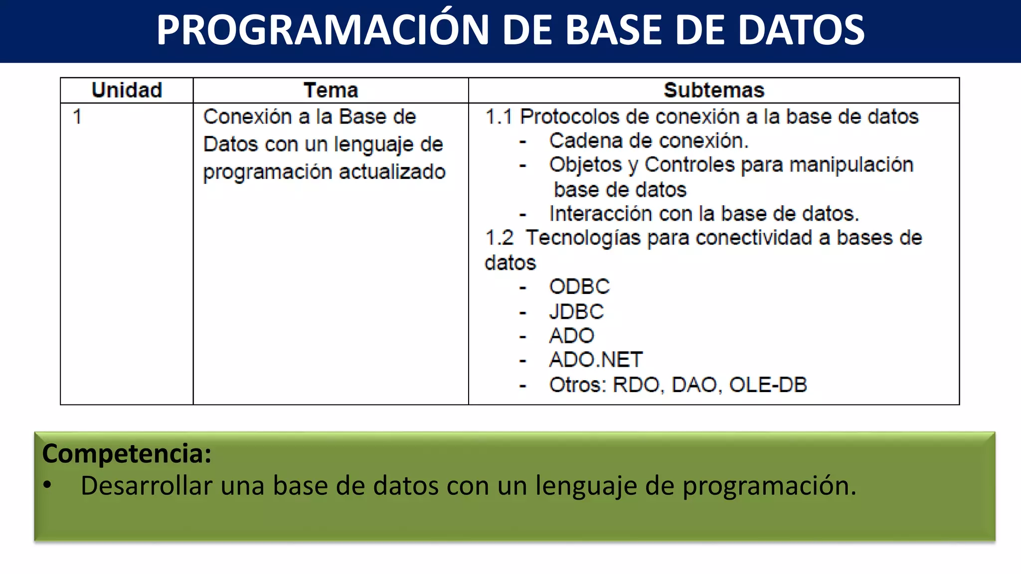 El documento presenta un material de clase sobre la programación de bases de datos, abarcando aspectos como la conexión a bases de datos, los elementos de la cadena de conexión y los tipos de objetos (tablas, índices, vistas) utilizados en bases de datos. Se detallan tecnologías de conectividad, lenguajes de definición y manipulación de datos, así como ejemplos y prácticas específicas para aplicar lo aprendido en un contexto de programación con C#. Finalmente, se incluye una bibliografía recomendada para profundizar en el tema.