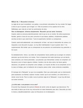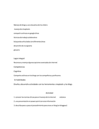 El documento habla sobre el manejo de blogs y herramientas educativas como cmaptools y Google Drive para el trabajo colaborativo. Incluye técnicas de búsqueda articulada entre áreas y el desarrollo de crucigramas y glosarios. Propone tres actividades: 1) conocer las normas éticas de Internet, 2) una presentación sobre el uso de blogs, 3) describir paso a paso cómo crear un blog.