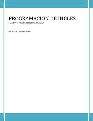 El documento presenta el programa de inglés para el grado 6o de la Fundación Instituto Barbula. Incluye los contenidos, logros, indicadores de logro y estrategias metodológicas a trabajar durante los 4 periodos académicos sobre temas como saludos, presentaciones, partes del cuerpo, meses, días de la semana, deportes y sentimientos. La docente Alejandra Vargas es la responsable de planear y desarrollar las clases de inglés para el grado.