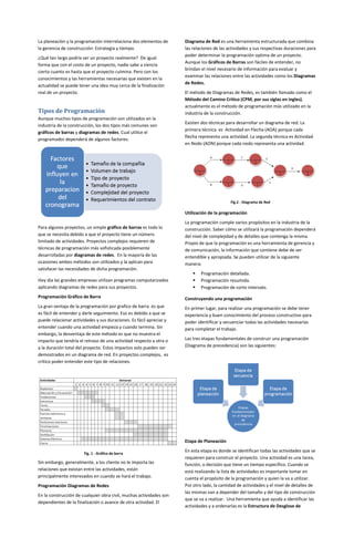 El documento explica la importancia de la programación de proyectos de construcción. Detalla los tipos de programación, incluyendo gráficos de barras y diagramas de redes. Explica las etapas de construir una programación: planeación para identificar actividades, secuencia para determinar el orden lógico, y programación para asignar duraciones. La programación permite planificar, monitorear y ajustar un proyecto para completarlo a tiempo.