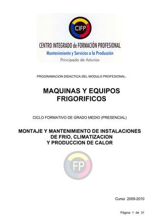Este documento presenta la programación didáctica del módulo profesional "Máquinas y Equipos Frigoríficos" para el ciclo formativo de grado medio de Montaje y Mantenimiento de Instalaciones de Frío, Climatización y Producción de Calor. La programación describe 15 unidades didácticas que cubren conceptos termodinámicos, el ciclo frigorífico, fluidos refrigerantes, componentes como condensadores y evaporadores, y mantenimiento de instalaciones frigoríficas. El objetivo es que