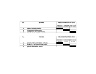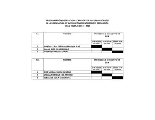 Este documento presenta el programa de disertaciones para candidatos a ocupar vacantes en la Licenciatura en Acondicionamiento Físico y Recreación durante el ciclo escolar 2014-2015. El programa detalla los nombres de 23 candidatos y sus horarios de presentación para 3 sesiones de disertación los días miércoles, jueves, viernes y sábado de la primera semana de agosto de 2014.