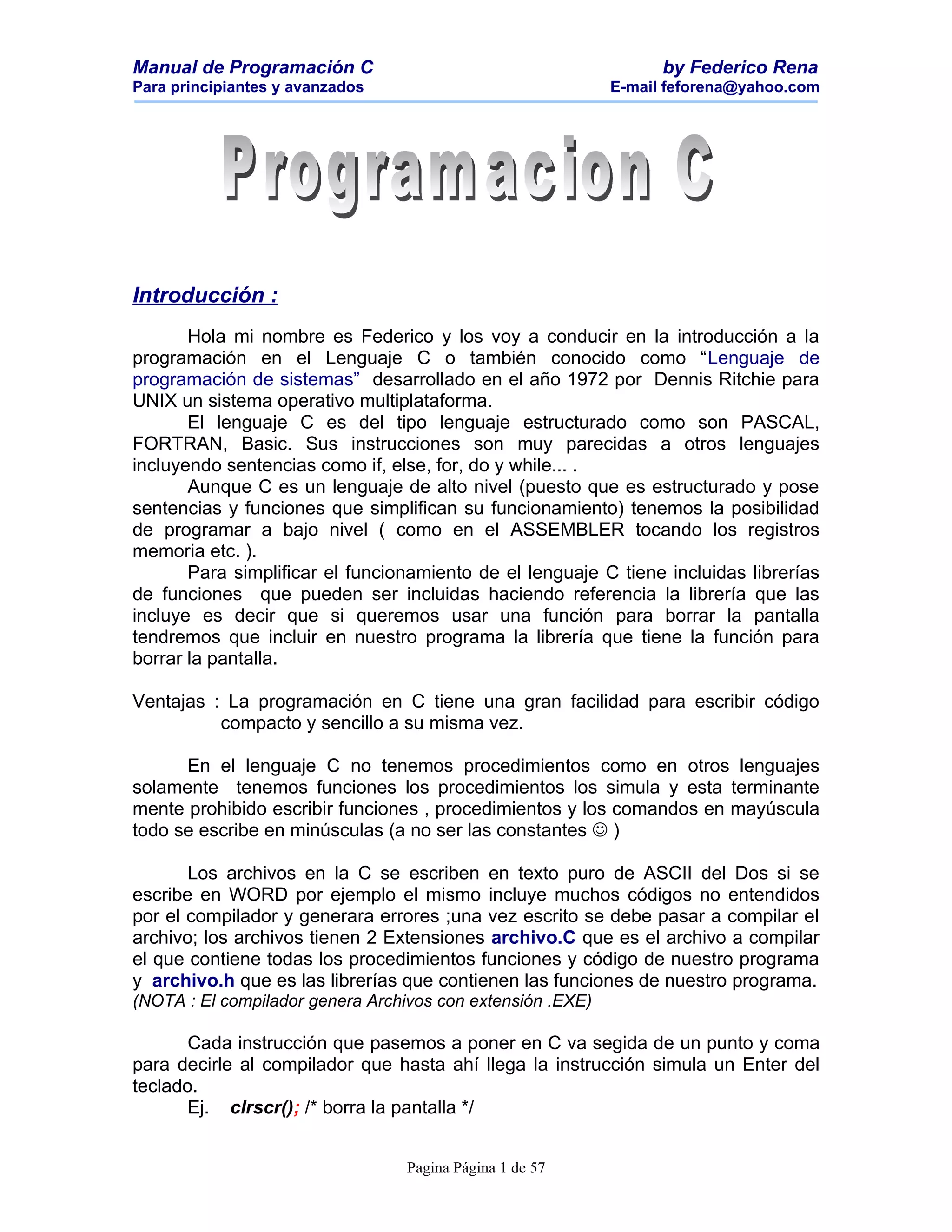 Este documento presenta un manual introductorio sobre programación en C dirigido a principiantes y avanzados. Explica conceptos básicos como estructura de programas en C, tipos de variables, constantes, comentarios, funciones y librerías. También incluye ejemplos simples de código en C para ilustrar estos conceptos.