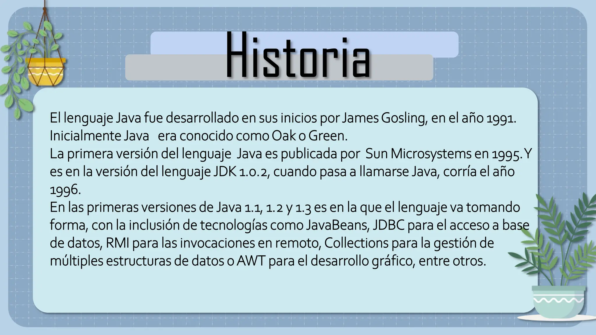 El lenguaje de programación Java fue desarrollado por James Gosling y publicado por Sun Microsystems en 1995, evolucionando a través de versiones que incorporaron diversas tecnologías. Java es un lenguaje orientado a objetos, simple, distribuido, seguro y multihilo, permitiendo la ejecución de aplicaciones en diferentes plataformas. Las herramientas como IDE y JDK, así como entornos de desarrollo como NetBeans, son esenciales para facilitar la programación en Java.