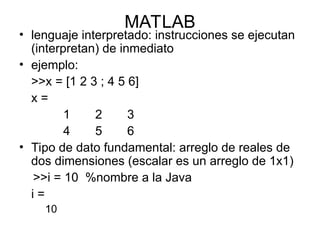 El documento detalla el uso del lenguaje de programación MATLAB, centrándose en su capacidad de ejecutar instrucciones de manera interactiva y la creación de arreglos y matrices. Se explican operaciones básicas y avanzadas en matrices, así como la escritura y ejecución de scripts M-files y funciones definidas por el usuario. Además, se abordan métodos numéricos para calcular áreas bajo curvas utilizando diferentes aproximaciones.