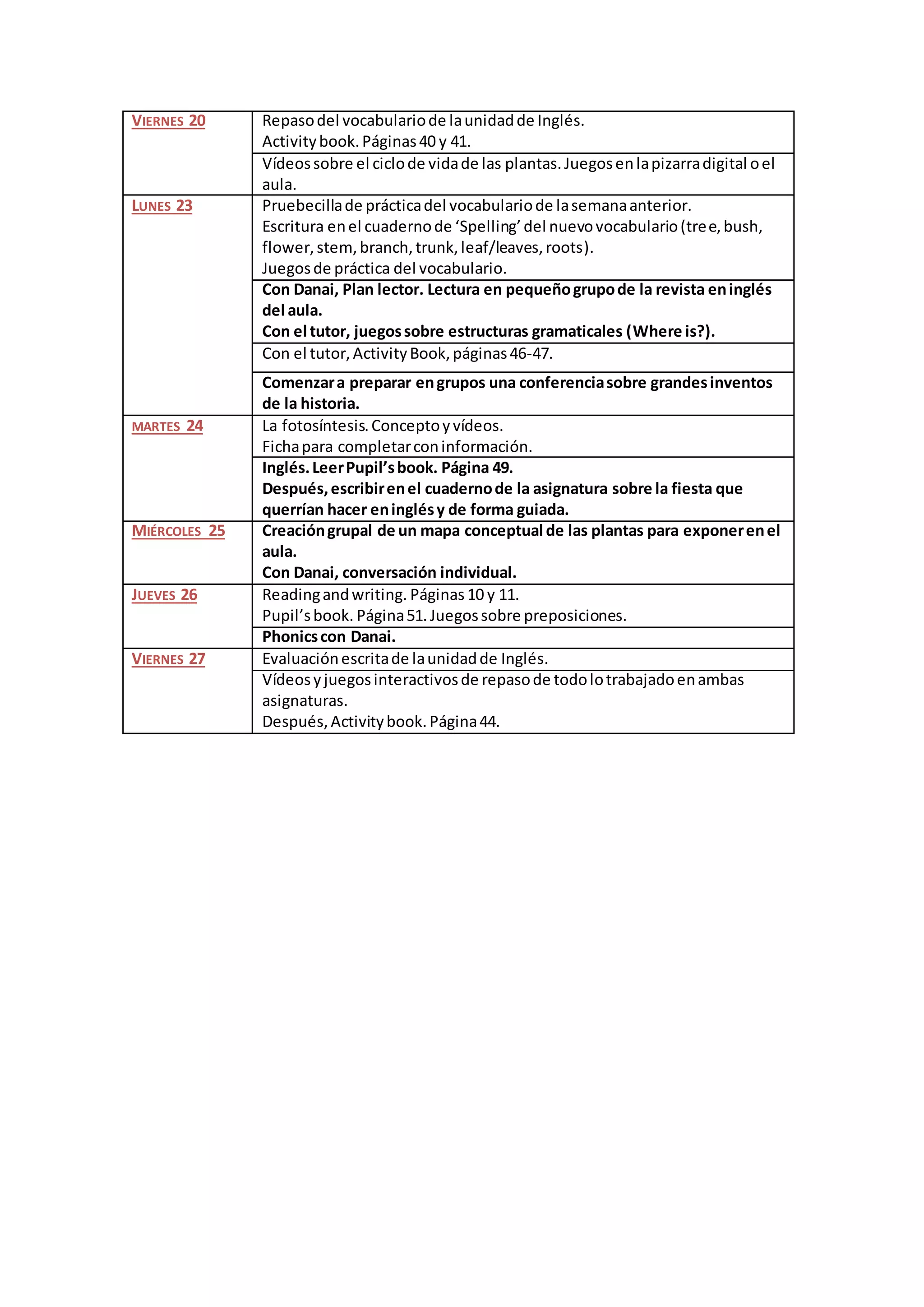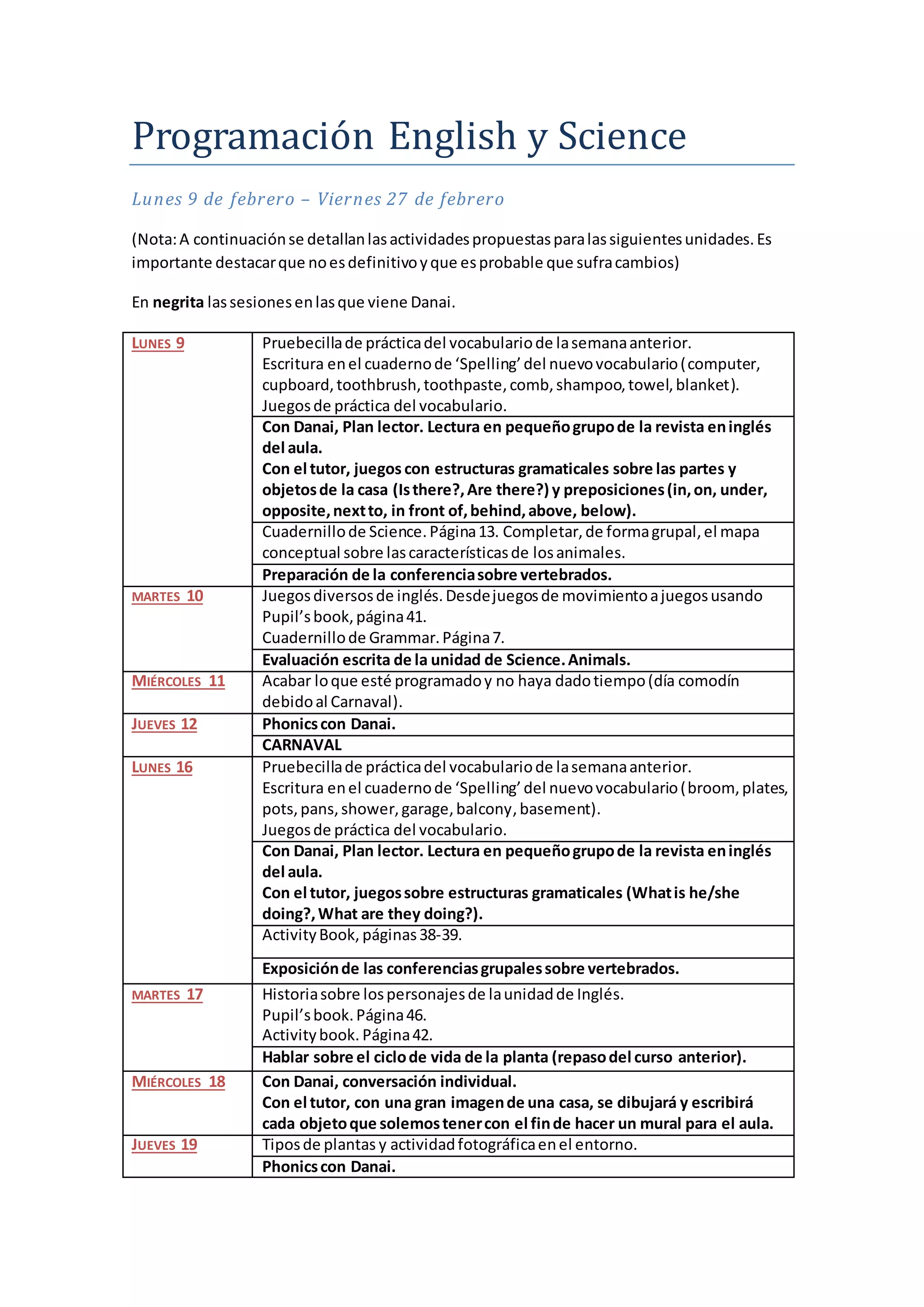 El documento presenta la programación de las asignaturas de Inglés y Ciencias para las semanas del 9 al 27 de febrero. Se detallan las actividades planificadas para cada día, que incluyen juegos de vocabulario, lectura, escritura, gramática, evaluaciones y proyectos sobre plantas, animales y la casa. También se realizarán exposiciones sobre vertebrados e inventos históricos. La programación está sujeta a posibles cambios.