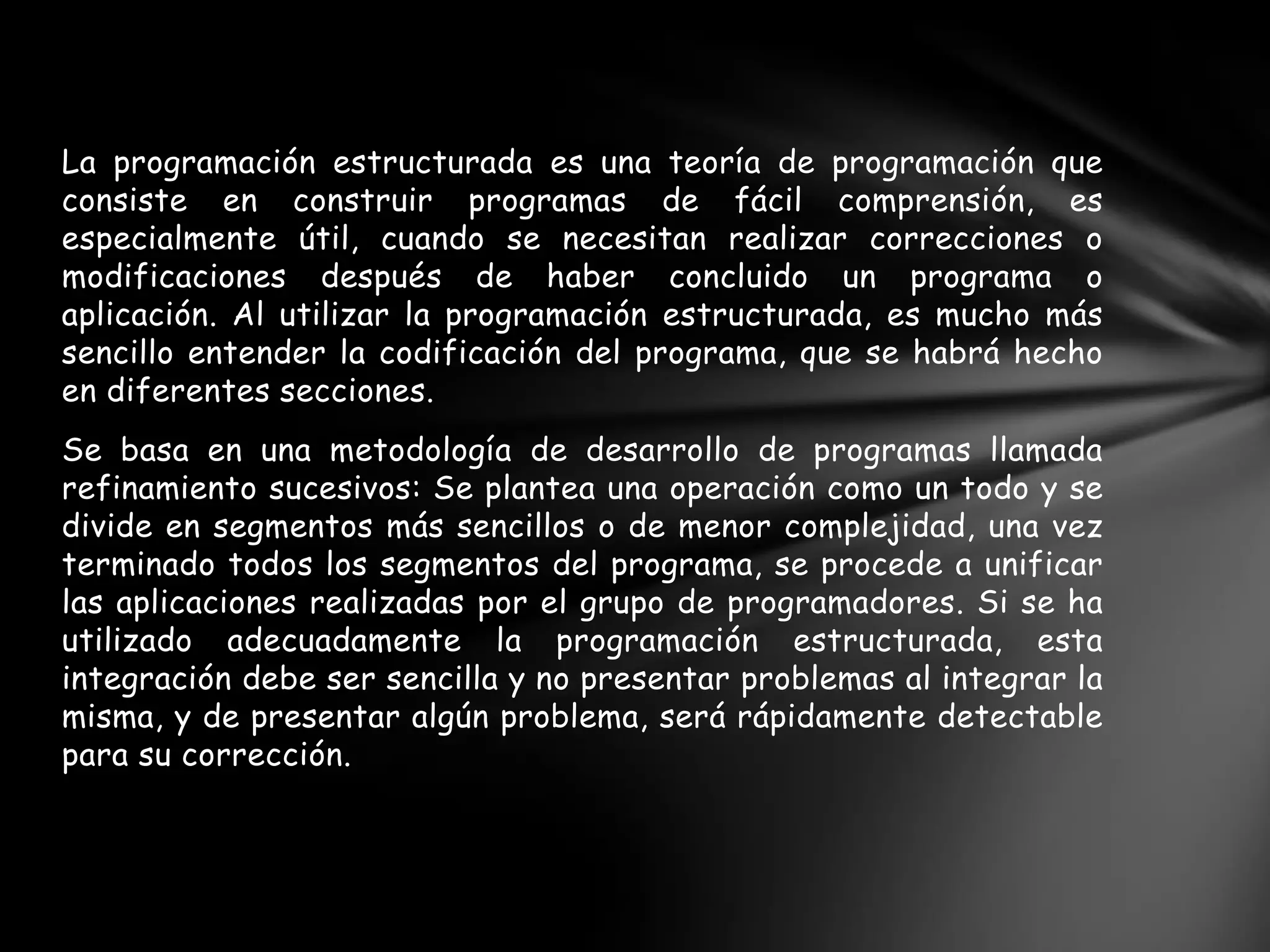 La programación estructurada es un método para construir programas de computadora de manera clara y fácil de entender mediante el uso de tres estructuras básicas: secuencia, selección e iteración. Esto hace que los programas sean más simples, con errores más fáciles de detectar y corregir.