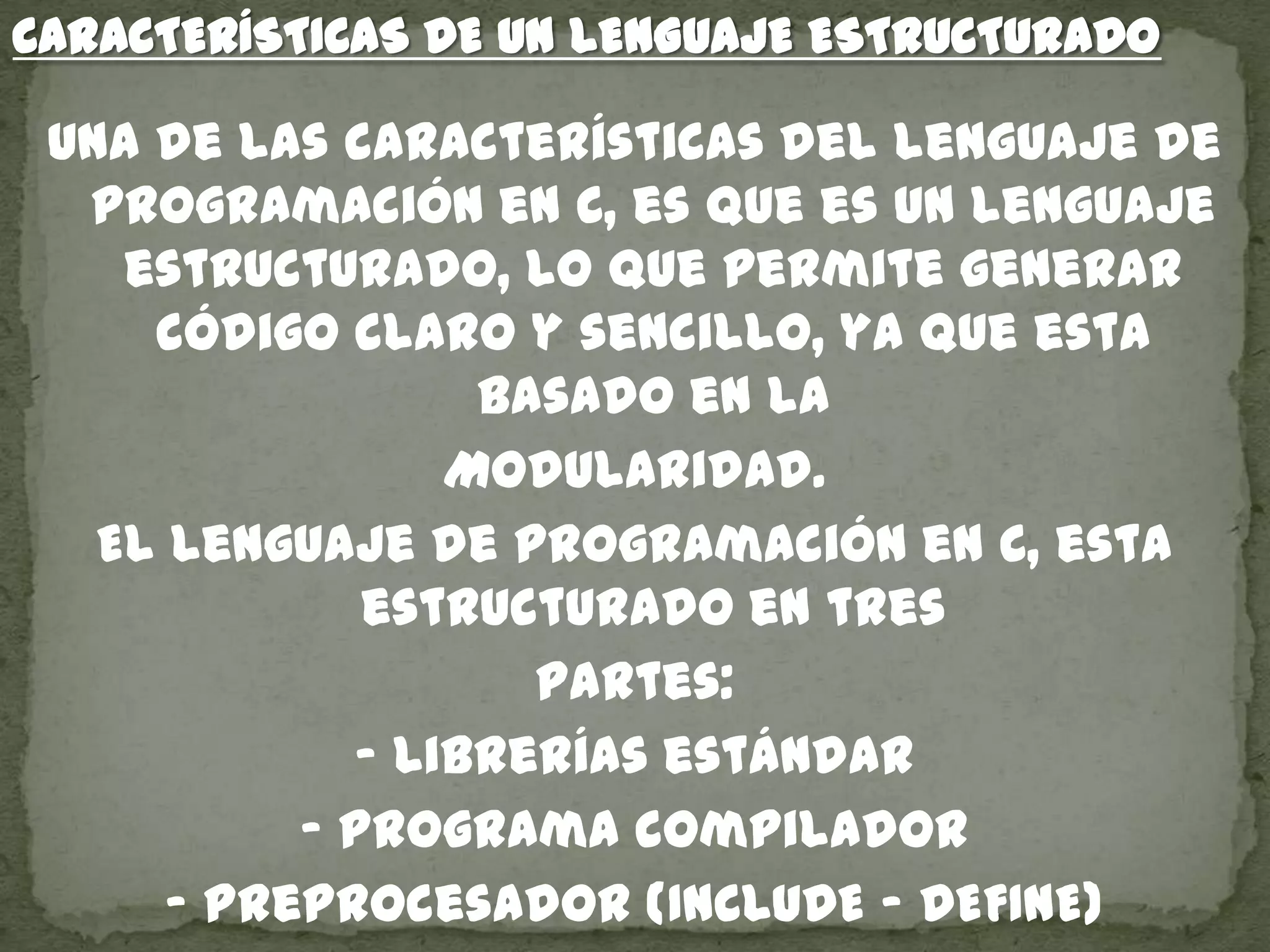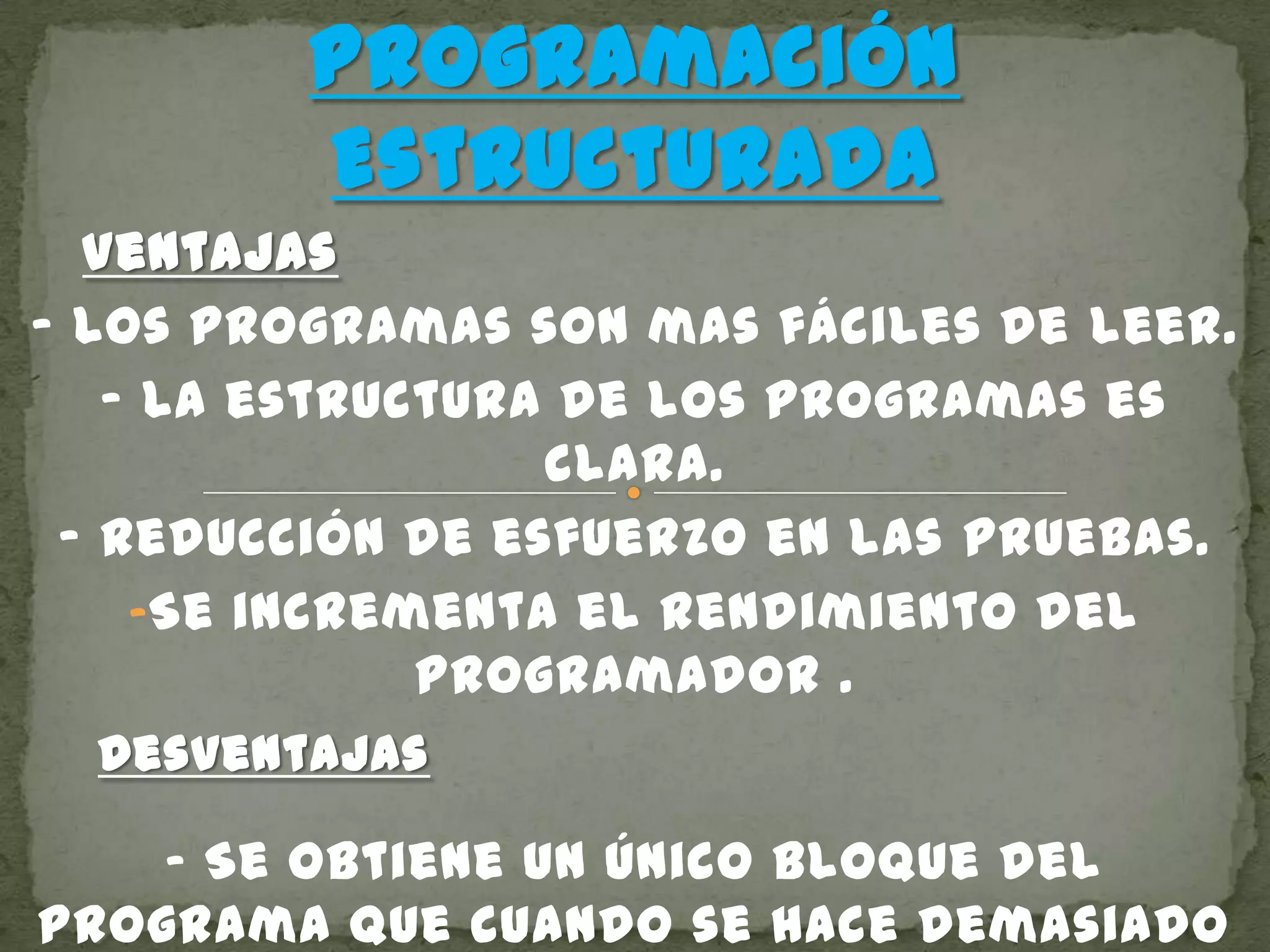La programación estructurada tiene ventajas como que los programas son más fáciles de leer y la estructura es más clara. Un lenguaje de programación estructurado como C se basa en la modularidad y está estructurado en librerías, programa compilador y preprocesador. Existen tres estructuras básicas: secuencial, selectiva y iterativa.