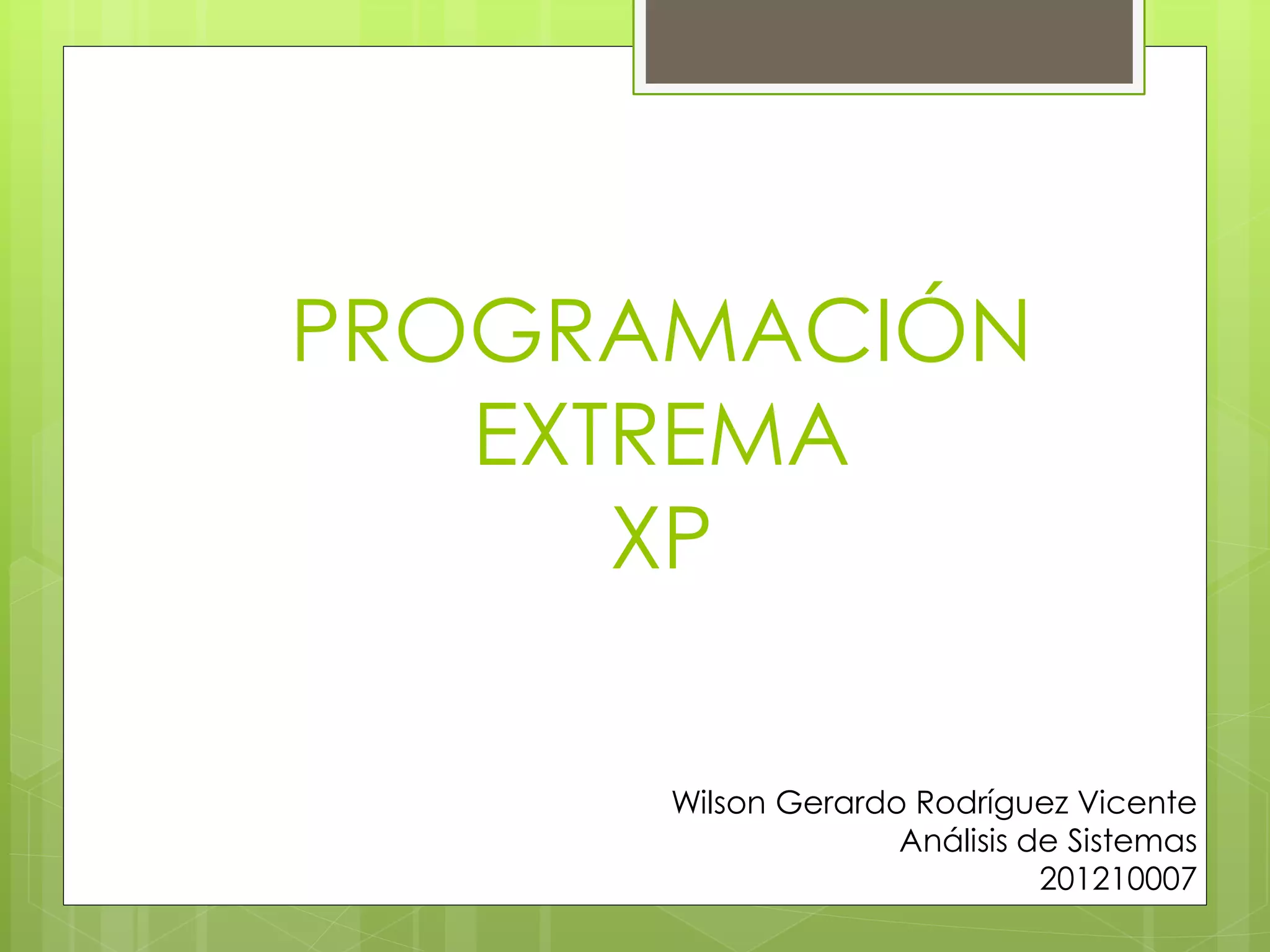 La programación extrema (XP) es una metodología ágil de desarrollo de software que busca aumentar la productividad y reducir la burocracia. Se basa en 12 principios agrupados en cuatro categorías: retroalimentación a escala fina, proceso continuo, entendimiento compartido y bienestar del programador. Algunas prácticas clave de XP incluyen pruebas automatizadas, programación en parejas, integración continua y entregas pequeñas frecuentes. XP puede ser una buena alternativa para ciertos entornos de