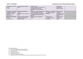 Este documento presenta una unidad didáctica sobre el verano y las actividades al aire libre. La unidad cubre siete ámbitos de experiencia relacionados con el desarrollo infantil. Los objetivos incluyen reconocer conceptos como el sol, el mar y los animales marinos, así como aprender sobre las estaciones y las medidas. Las actividades propuestas son cuentos, juegos, canciones y trabajos manuales para desarrollar el lenguaje, la motricidad y la convivencia entre los niños.