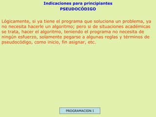 El documento proporciona indicaciones sobre el pseudocódigo. Explica que el pseudocódigo es un lenguaje general para especificar algoritmos y que puede traducirse a cualquier lenguaje de programación. Además, detalla los pasos para definir problemas usando algoritmos: 1) comprender el problema, 2) identificar las entradas, procesos y salidas, y 3) comprobar el algoritmo. Finalmente, incluye un ejemplo de algoritmo para sumar tres números.
