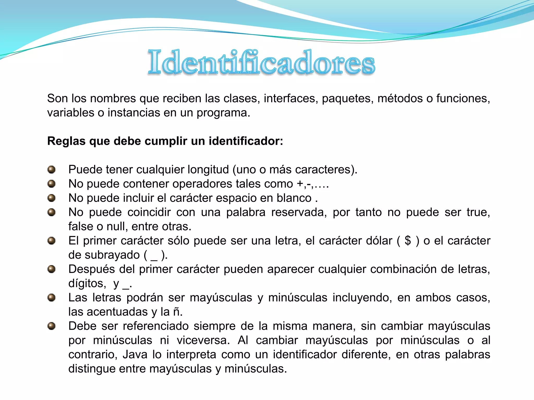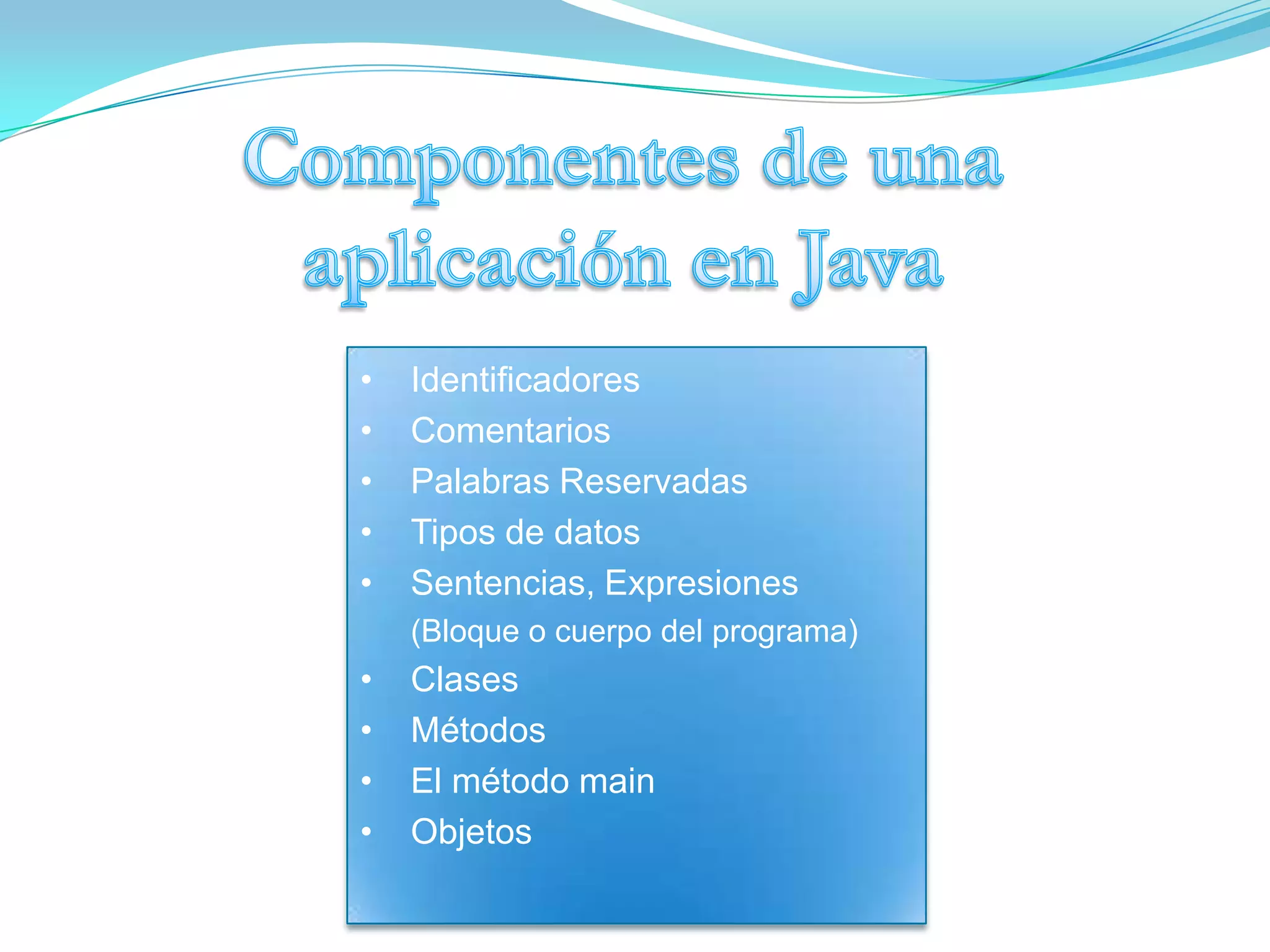 El documento describe los componentes básicos de una aplicación en Java, incluyendo identificadores, comentarios, palabras reservadas, tipos de datos, sentencias, clases, métodos como el método main y objetos. Explica las reglas para identificadores y diferentes tipos de comentarios. También describe palabras reservadas, tipos de datos primitivos, operadores y el propósito del método main.