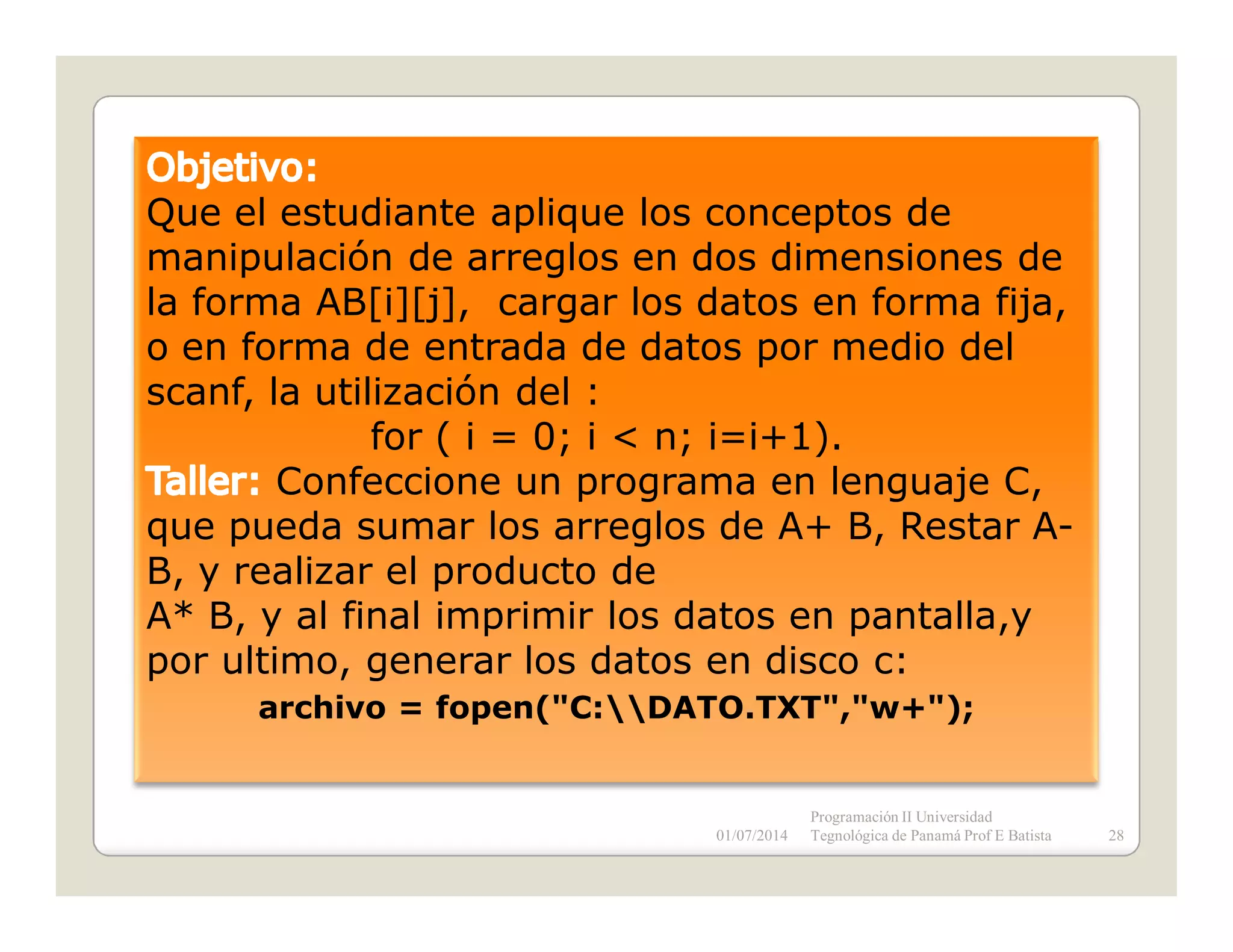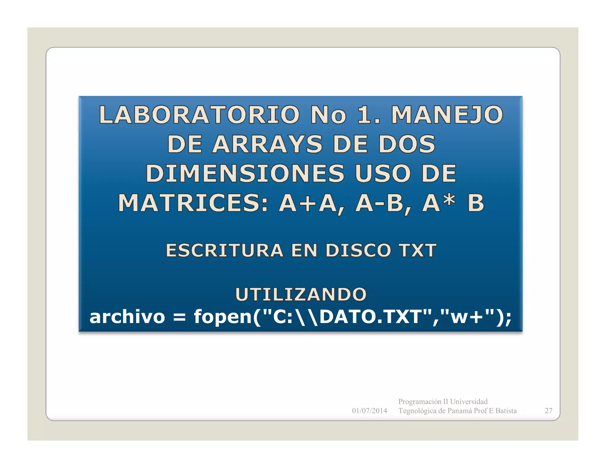 El documento presenta el código fuente en lenguaje C para realizar operaciones con arreglos bidimensionales como suma, resta y multiplicación de matrices. Se explican los pasos para cargar los datos en las matrices, realizar los ciclos para iterar sobre las filas y columnas, y almacenar los resultados de las operaciones matriciales en nuevas matrices. El documento también indica los requisitos para la presentación del informe del laboratorio, incluyendo introducción, materiales, código, salidas e imágenes generadas, y glosario.