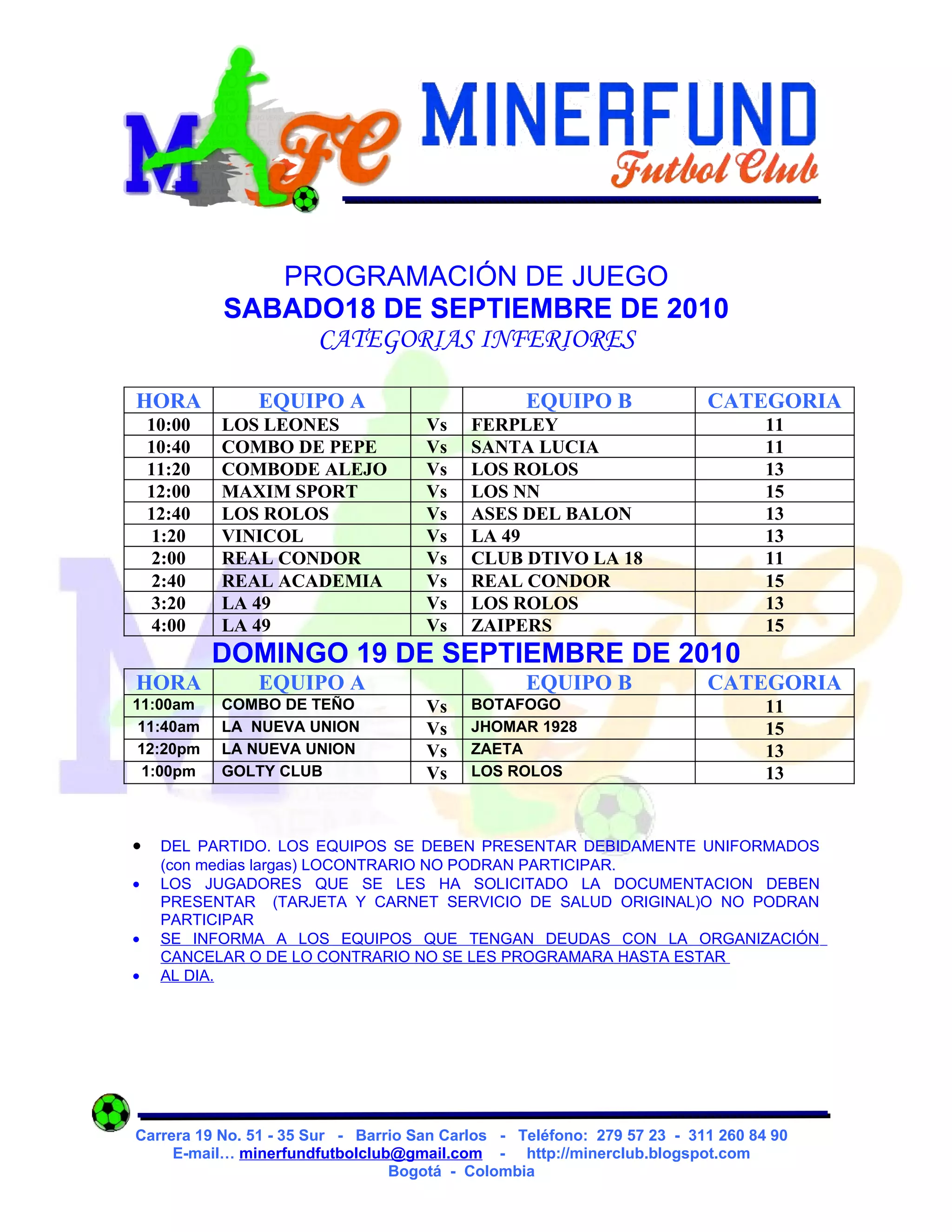 El documento presenta la programación de partidos de fútbol para las categorías inferiores que se llevarán a cabo los días sábado 18 y domingo 19 de septiembre de 2010. Se enumeran los equipos participantes y la hora de cada partido. También incluye instrucciones sobre la presentación de los jugadores y el pago de deudas por parte de los equipos.