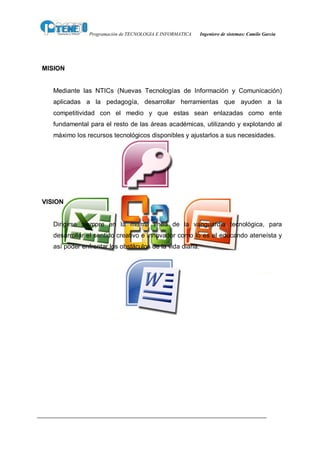 Este documento presenta la programación de la asignatura de Tecnología e Informática en el colegio ATENEO EL ROSARIO. El Ingeniero Camilo García es el coordinador del área y es responsable de la asignatura desde primero hasta undécimo grado. La programación incluye la misión, visión, justificación, objetivos, estrategias metodológicas, criterios de evaluación, recursos didácticos y contenidos programáticos organizados por grado. Los contenidos van desde conceptos básicos de hardware y software hasta aplicaciones avanz