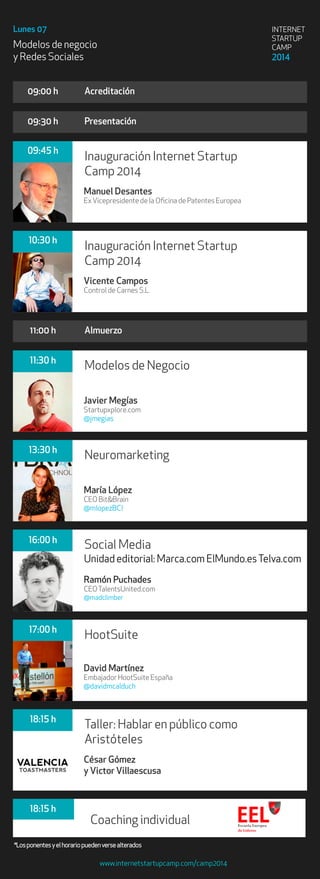 El documento presenta el programa de un evento de cuatro días sobre emprendimiento e internet que incluye charlas, casos de éxito y talleres sobre temas como modelos de negocio, marketing móvil, posicionamiento en buscadores, análisis web, comercio electrónico y financiación para emprendedores.