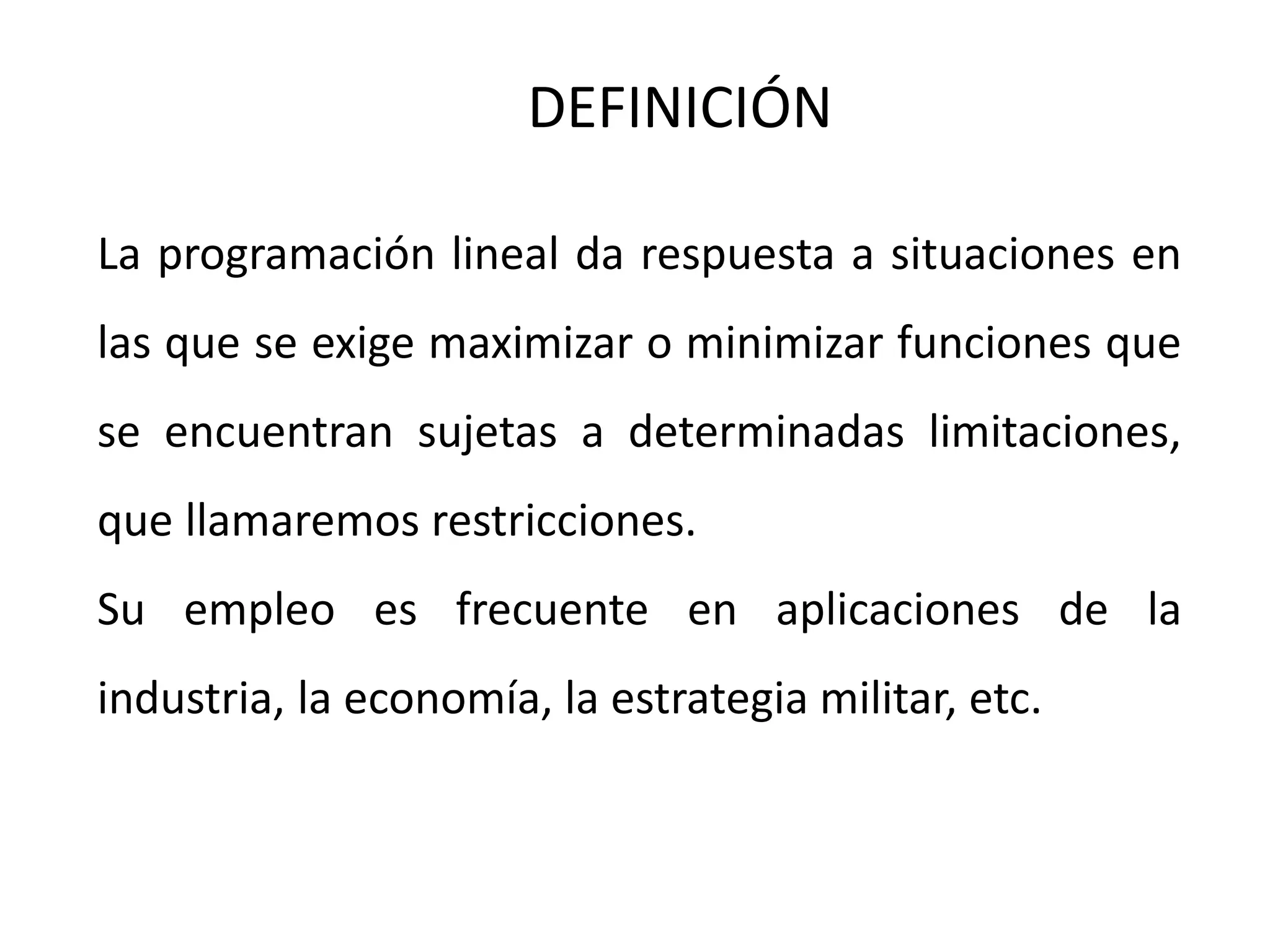 La programación lineal se utiliza para maximizar o minimizar funciones lineales bajo ciertas restricciones en diversas aplicaciones, como la industria y la economía. Consiste en definir una función objetivo, establecer restricciones y encontrar la región de soluciones factibles, donde se identifican las soluciones óptimas en los vértices. Se explican pasos para resolver problemas prácticos de programación lineal a través de ejemplos que involucran recursos limitados y beneficios potenciales.