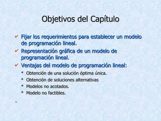 Este documento presenta los conceptos básicos de la programación lineal. Explica cómo formular un modelo de programación lineal con variables de decisión, restricciones y función objetivo. Describe un ejemplo de optimización de la producción de juguetes y cómo resolverlo gráficamente y con el método simplex. También cubre el análisis de sensibilidad y diferentes tipos de soluciones como óptimas, no factibles o no acotadas. Finalmente, menciona el uso de software para resolver grandes modelos lineales.