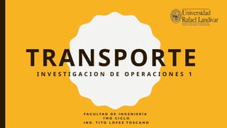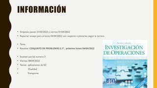 El documento detalla información sobre un simposio, tareas y exámenes relacionados con un curso de modelado de transporte en ingeniería. Incluye ejemplos de problemas prácticos como la determinación de costos de transporte y balanceo de modelos, así como métodos para encontrar soluciones óptimas. Se presentan métodos específicos para abordar el problema de transporte, incluyendo el método de la esquina noroeste, el costo mínimo y el de aproximación de Vogel.