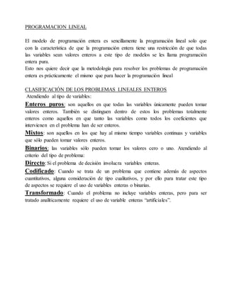 El documento trata sobre programación lineal entera. Explica que la programación lineal entera es similar a la programación lineal regular, excepto que todas las variables deben ser valores enteros. Luego clasifica los problemas lineales enteros y describe métodos comunes para resolverlos, incluido el uso de variables binarias. Finalmente, presenta ejemplos como la selección de proyectos y la cobertura de conjunto para ilustrar cómo aplicar la programación lineal entera.