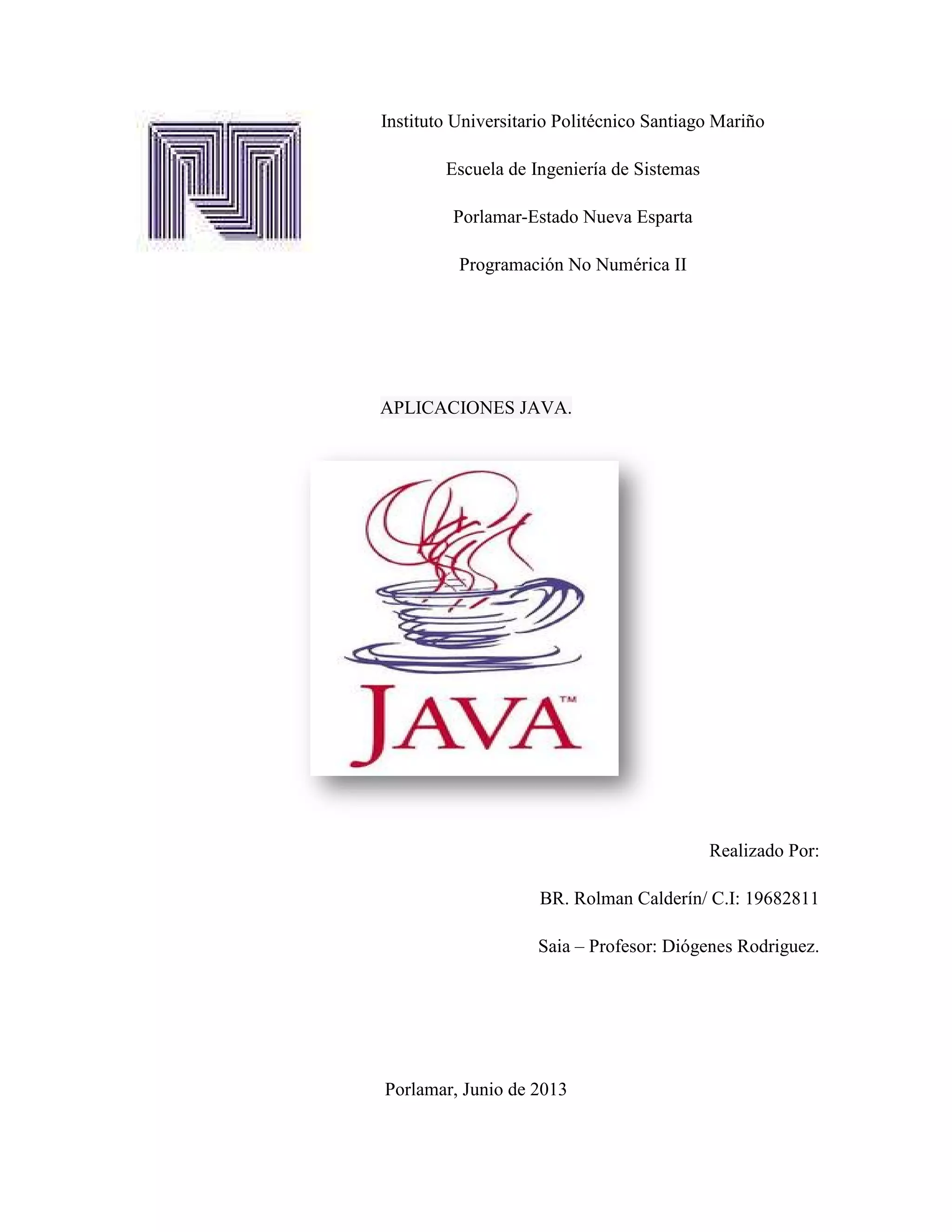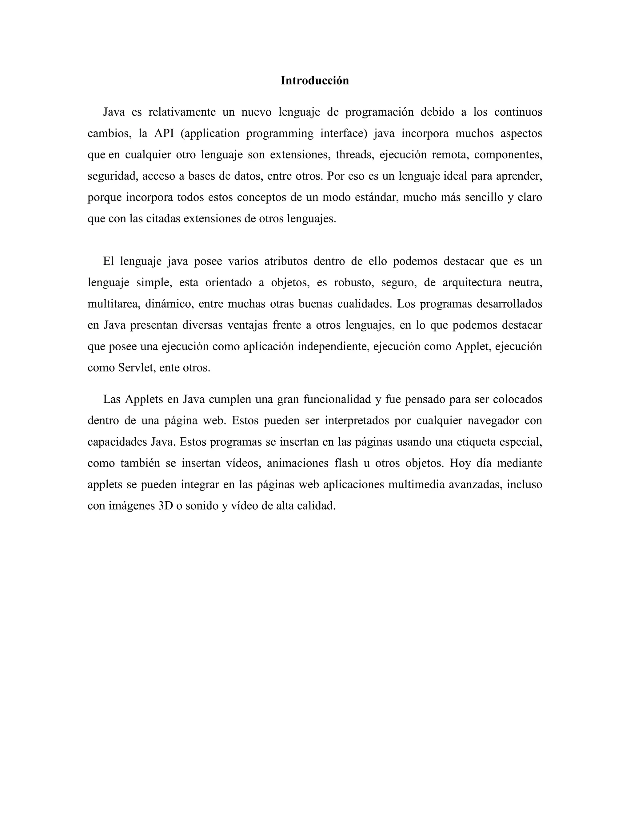 El documento describe las aplicaciones de Java, incluyendo applets, servlets y entrada/salida de datos. Explica que Java es un lenguaje orientado a objetos, robusto y seguro. Detalla que los streams son usados para entrada/salida de datos, incluyendo streams de bytes y caracteres. También cubre temas como clases abstractas como InputStream, OutputStream, Reader y Writer, y la clase File que representa archivos.