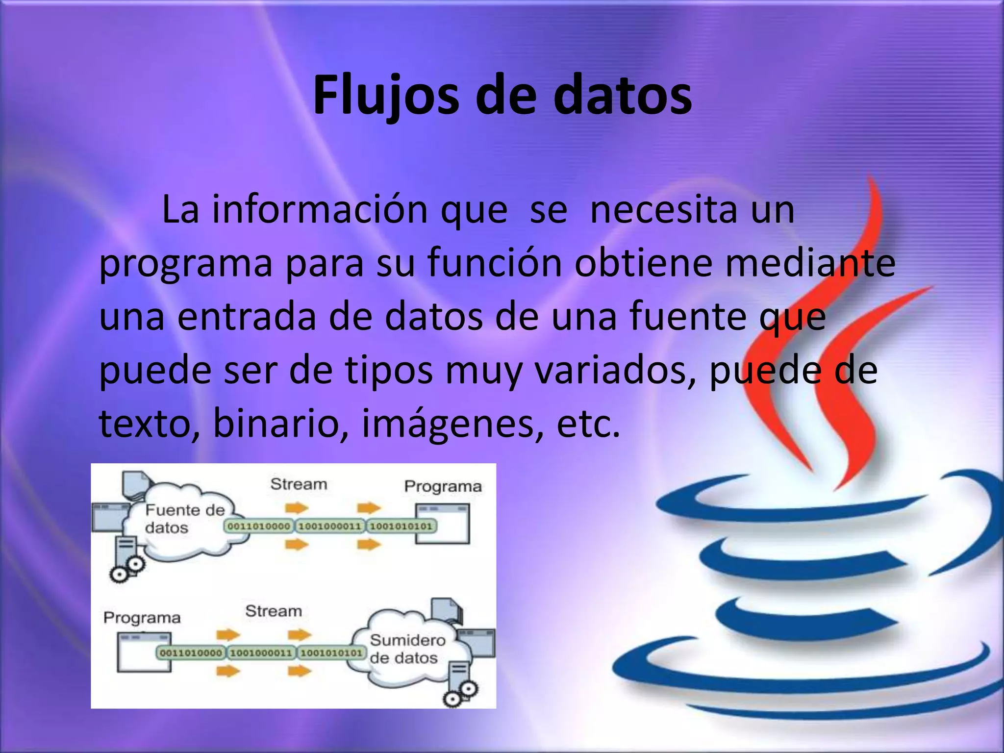 El documento habla sobre flujos de datos en Java. Explica que los programas obtienen información de fuentes de entrada mediante la apertura de conductos (streams) y envían información a destinos de salida también a través de conductos. Describe los tres pasos para leer o escribir datos: abrir el flujo, leer/escribir los datos, y cerrar el flujo. También menciona las clases relacionadas con flujos de entrada, salida y lectura/escritura de caracteres y bytes en Java.